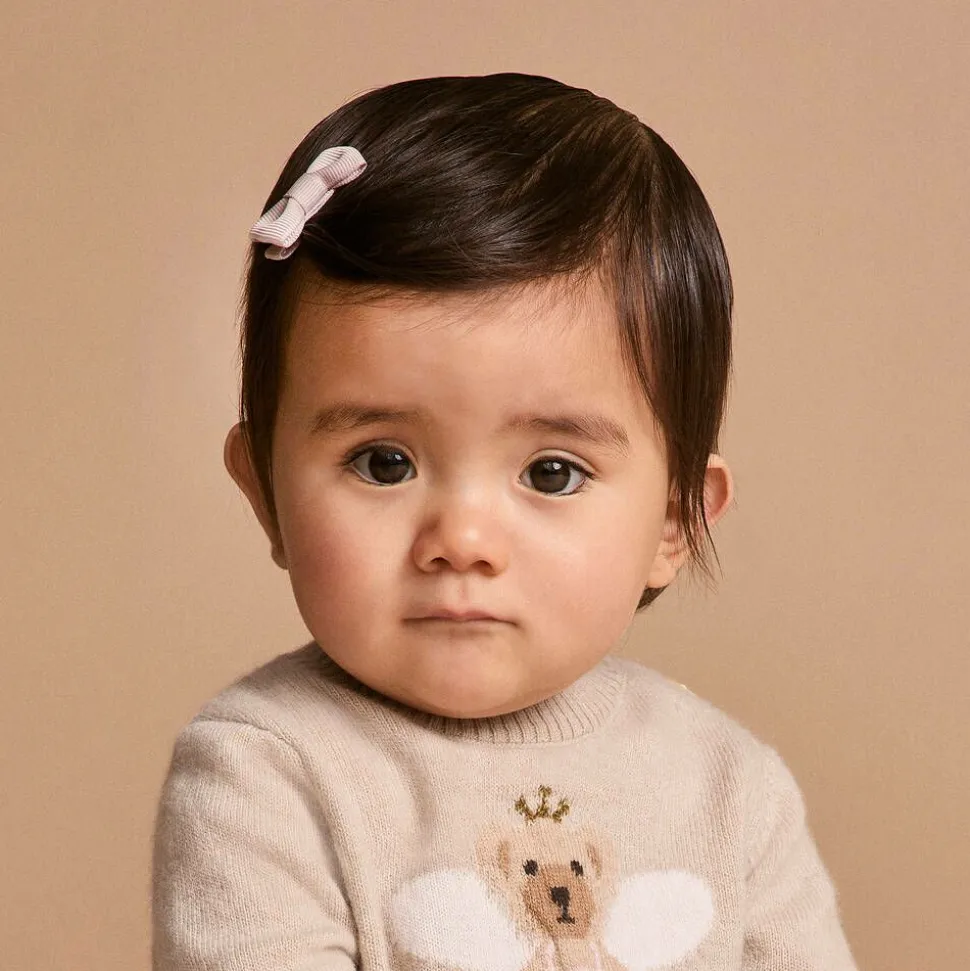 Girls pack of six hair clips by Milledeux. The bows are made in soft grosgrain ribbon in a variety of gorgeous colours, including shades of pink, white and blue. Each hair accessory secures with a small metal clip.