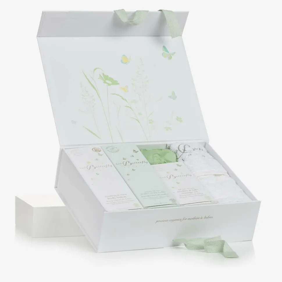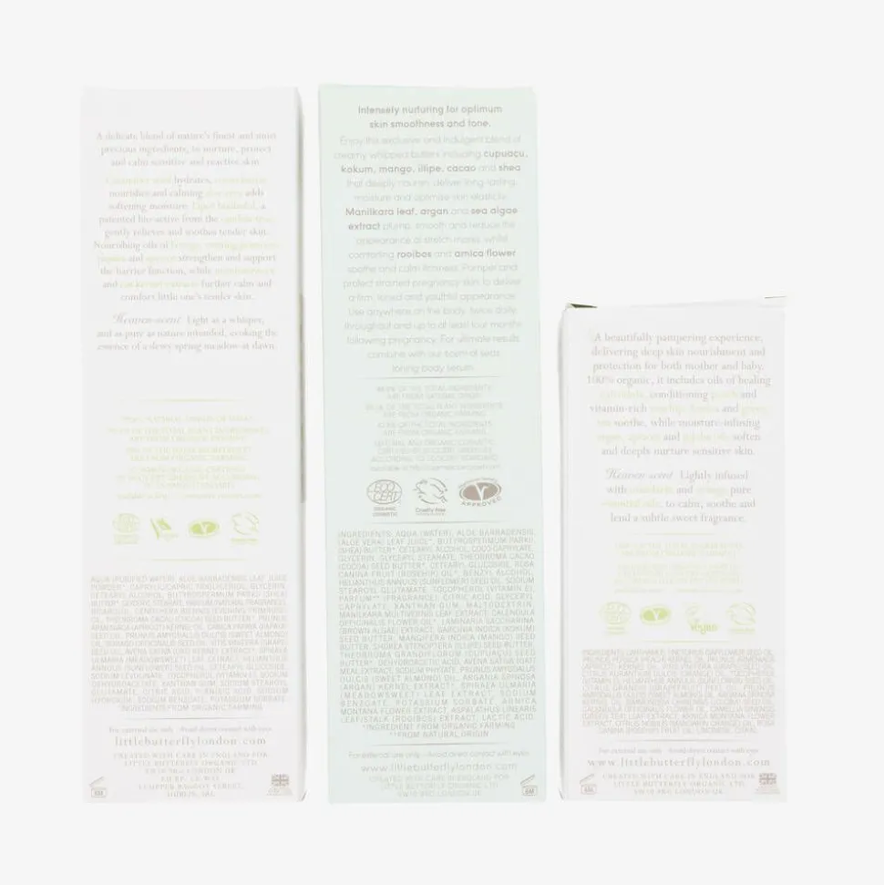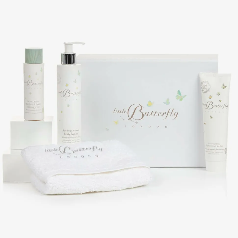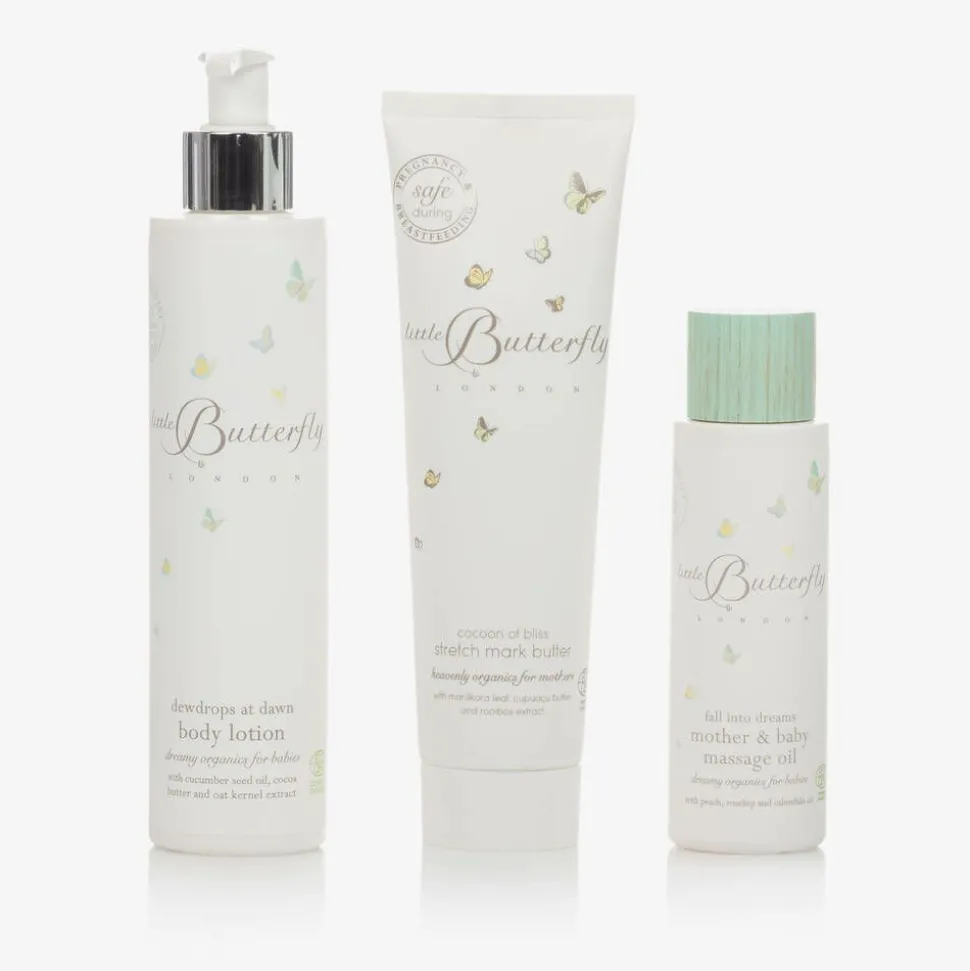 A lovely four-piece gift set for mothers and babies by Little Butterfly London, exclusive to Childrensalon. Gentle enough to use from birth, this organic-certified set comprises body lotion, stretch mark butter, massage oil, and a pure cotton hand towel. Delicately scented with naturally derived fragrance, each dermatologist-approved skincare item is enriched with botanicals and gentle extracts to cleanse, nourish and soothe even the most delicate and sensitive of skin. The stretch mark butter is safe for use during pregnancy and breastfeeding.
