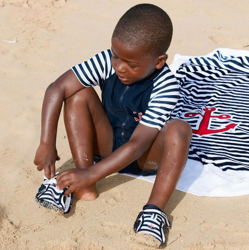 Little boys and girls navy blue all-in-one sun suit by Playshoes, with stripy sleeves and an anchor motif. With UPF 50+, this silky and stretchy one-piece fastens with a zip on the front for easy dressing, and is great to wear by the pool or on the beach.