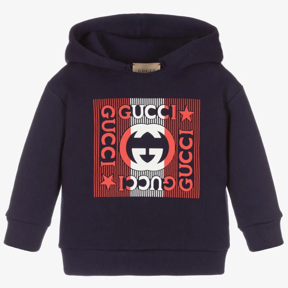 Navy blue hooded sweatshirt for little boys and girls, by luxury Italian brand Gucci. With distressed detailing at the neckline, it is made in soft cotton jersey for comfort. Paying homage to the brand's logo history, it has a red and white Gucci vintage logo print on the front, incorporating the designer's Interlocking G logo with playful stars and stripes.