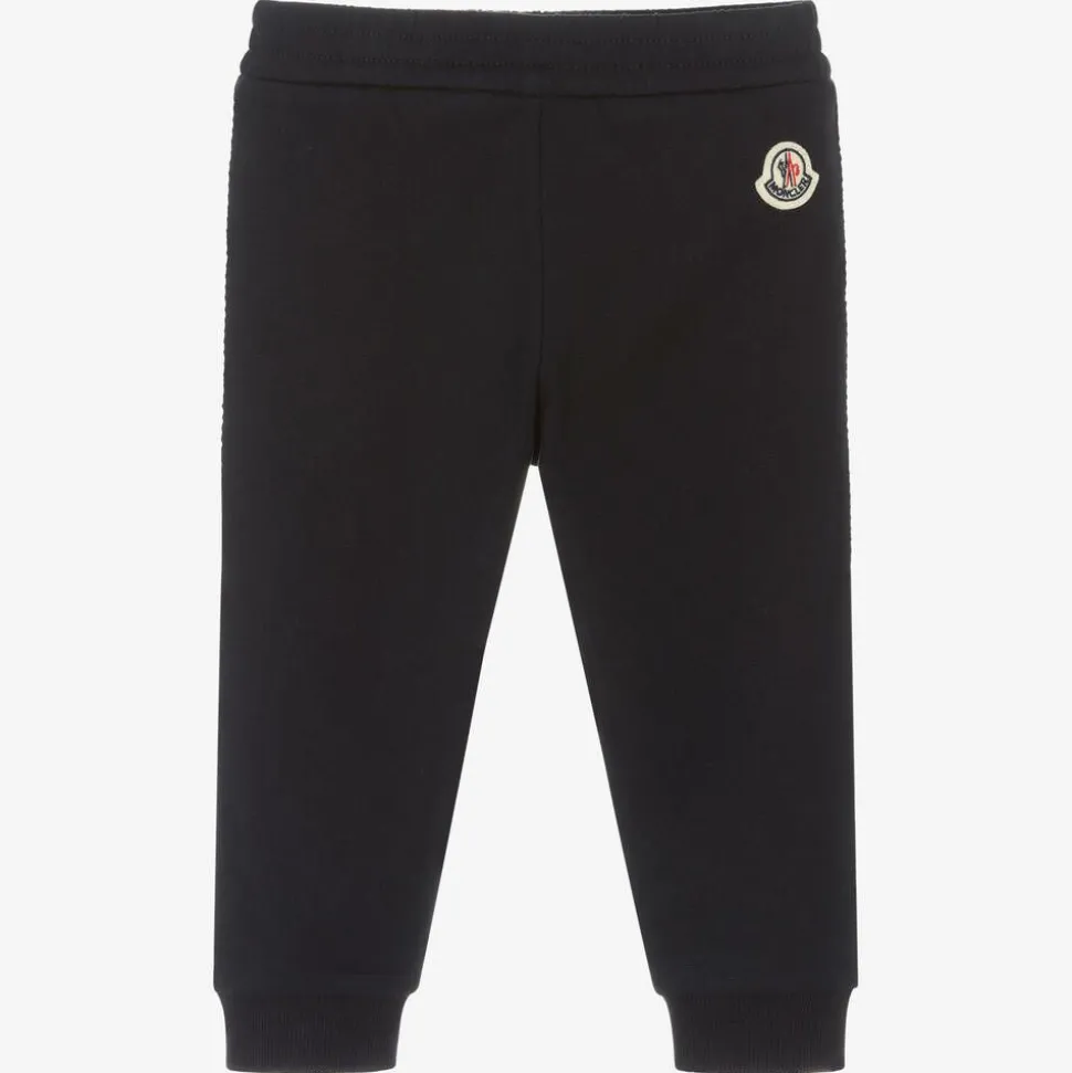 Navy blue joggers for boys by luxury French brand Moncler Enfant, made in soft cotton jersey with a warm fleecy inside. They have a knitted red and navy blue tape trim on each leg with ribbed ankle cuffs, and the brand's iconic logo patch on the back.