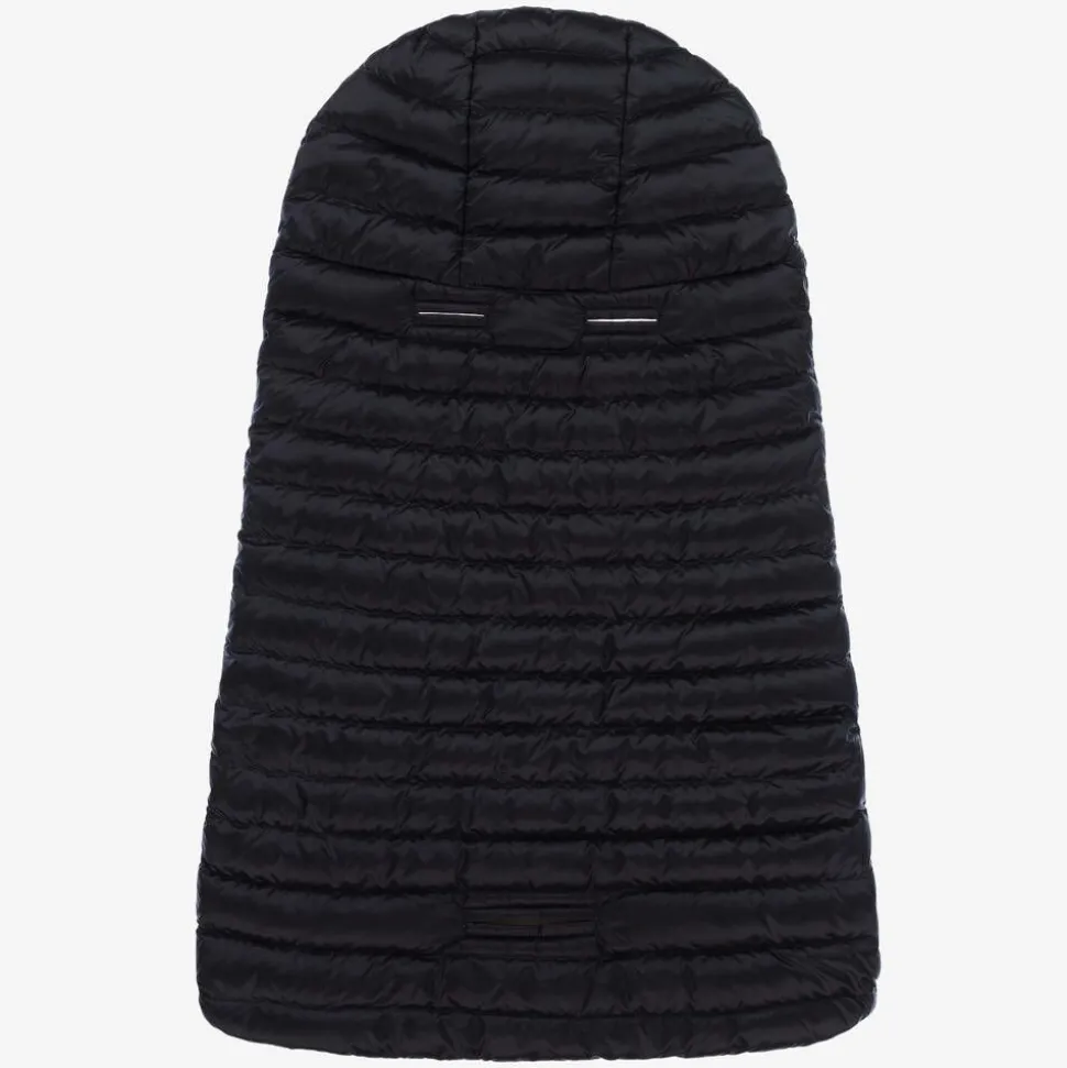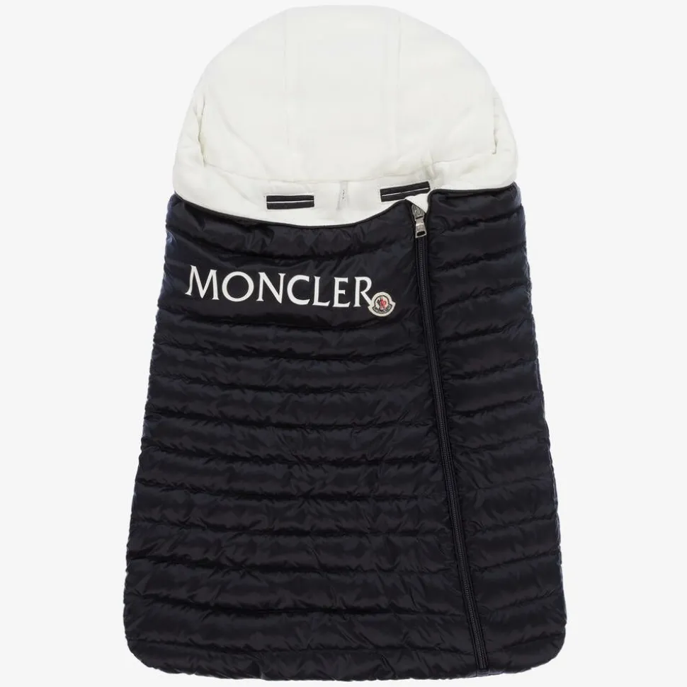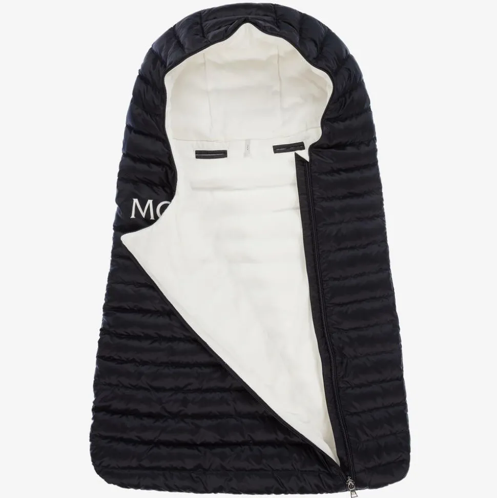 A lightweight, navy blue hooded nest for baby boys and girls from luxury brand Moncler Enfant. Silky smooth with a puffer style quilting on the exterior, it is luxuriously down padded and fully lined in soft ivory cotton jersey for comfort. It has a bold white logo printed across the front with the iconic logo badge accent and easily zips up on the front. The slit openings on the back allow safety straps on a pram to be threaded through so it can be used safely as a cosy footmuff.