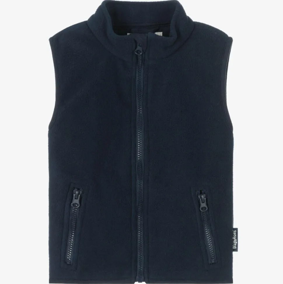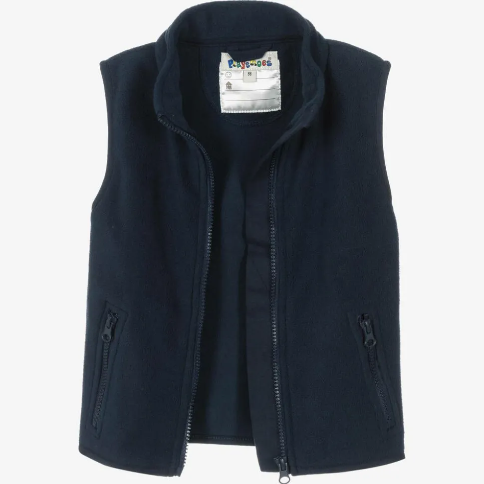 Navy blue gilet for boys and girls from Playshoes, made from soft fleece with matching trims. It has a high neck, a chin guard on the top of the zipper and two useful zipped pockets. Practical and versatile for everyday, it also makes a cosy layering piece when the season changes.