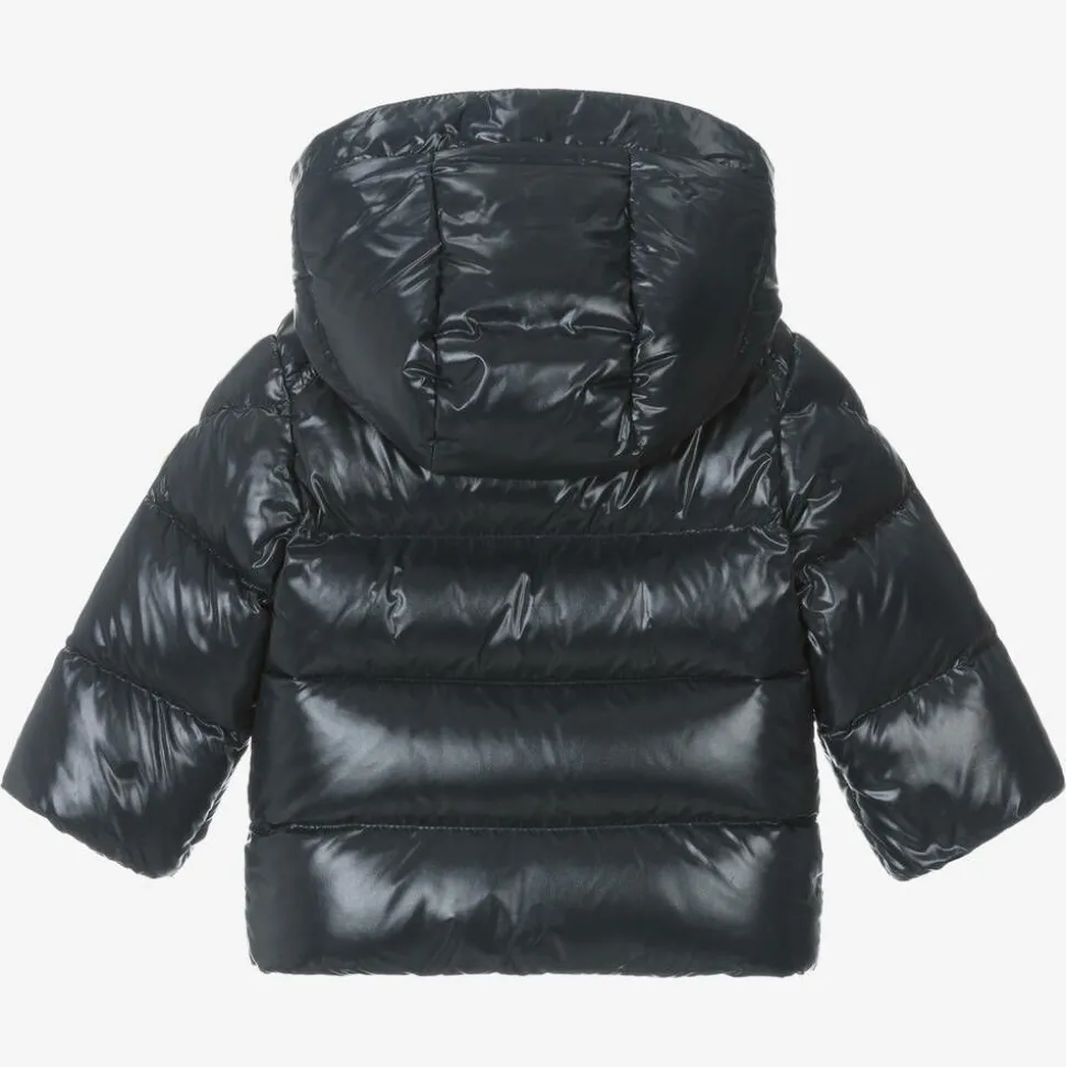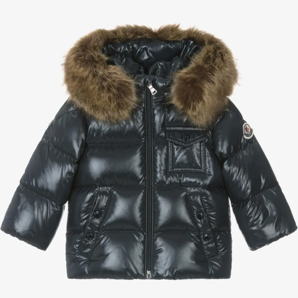 Navy blue zip-up puffer jacket for little boys and girls by luxury brand Moncler Enfant. Luxuriously down padded, it is made in silky smooth nylon laquƩ with a shiny water-repellent finish and has elasticated cuffs to keep the warmth in. Stylish yet cosy, it features a detachable hood with removable faux fur trim, three front pockets with branded poppers, and the iconic felt logo patch appliquƩd on one sleeve.