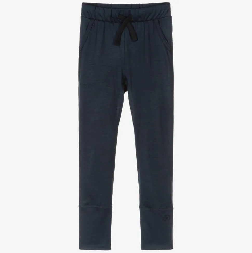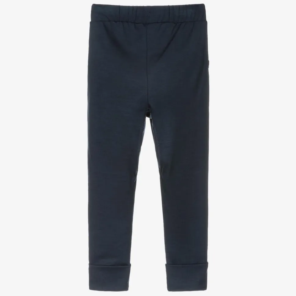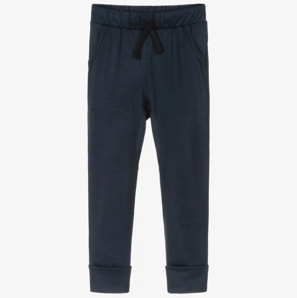 Navy blue joggers for boys and girls by Smalls Merino, beautifully made in Portugal. Soft and highly breathable, these slim-leg joggers are finely knitted in sustainable and temperature-regulating ZQ Merino wool jersey. Kind to sensitive skin, these versatile trousers are an ideal option for lounging or as a lightweight base layer in colder temperatures. They have useful front pockets, a stretchy, drawstring waist and foldable cuffs that can be turned down when little ones grow.