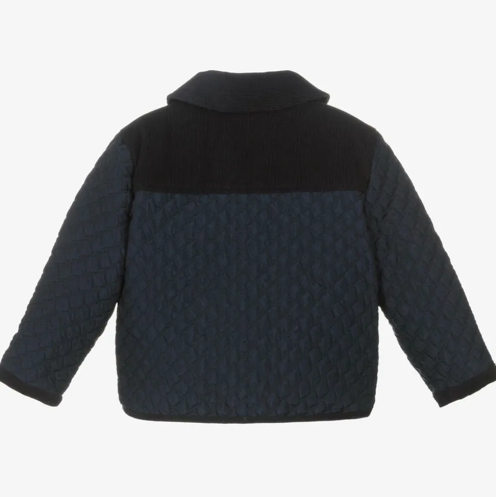 Smart-casual quilted navy blue jacket for boys and girls by traditional British brand Beatrice & George. Exclusive to Childrensalon, it is smooth and silky, with a corduroy collar, shoulders and trims. On the front it fastens with easy-to-use poppers and has useful patch pockets. It has an ivory satin lining for comfort, patterned with jacquard monogram logos.