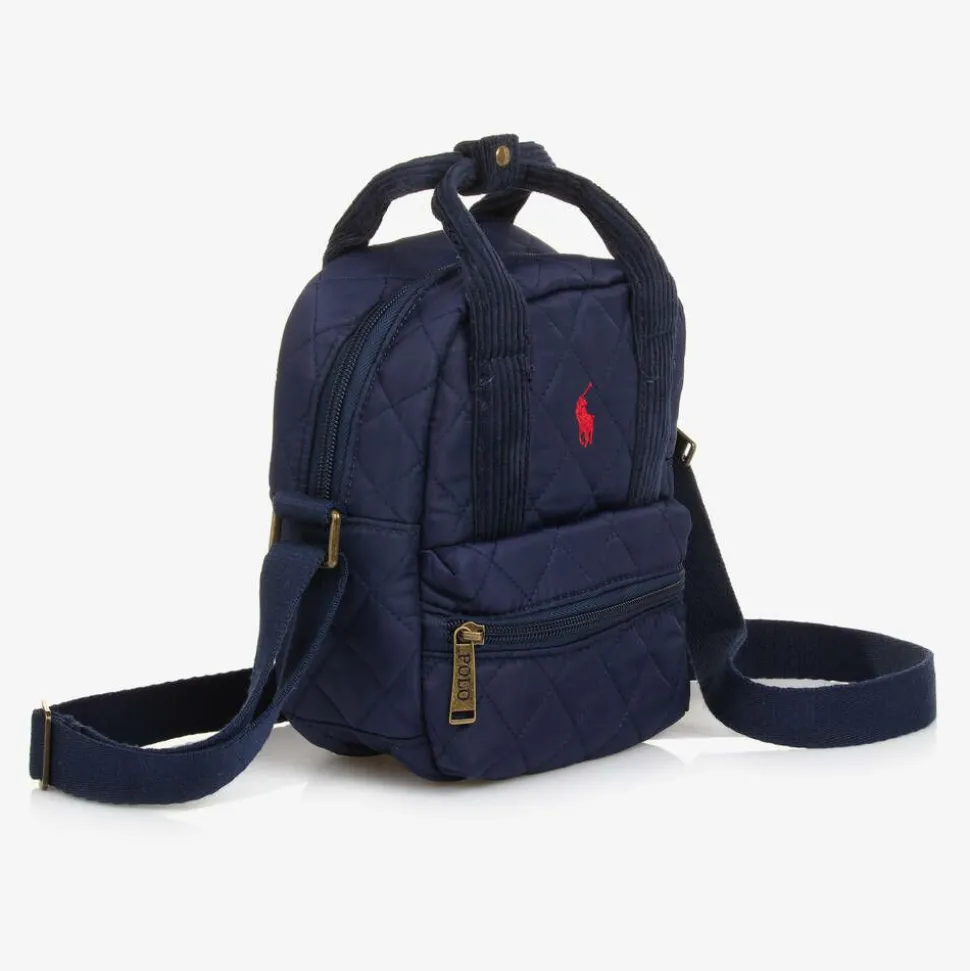 From Ralph Lauren, a navy blue messenger bag for boys and girls. Made in recycled silky fabric with a classic quilted pattern, this useful bag has two zip fastening compartments and is finished with the brand's signature Pony logo on the front.
