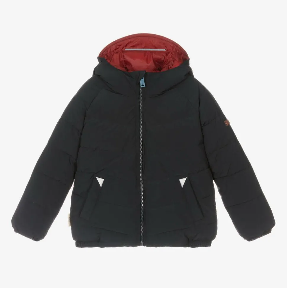 A reversible, hooded puffer jacket for boys and girls by British brand Töastie, matt navy blue on one side and silky red on the other. This water-repellent outerwear piece is lightweight yet provides superior warmth with mid-weight insulation. The hood has a short peak and is gently elasticated on the sides for added protection from the weather. Both sides feature fleece-lined pockets with popper fastenings, reflective detailing for improved visibility, logo tabs on one sleeve and branded elasticated cuffs.