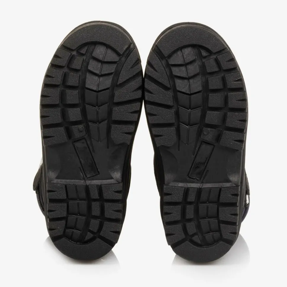 Navy blue snow boots for boys and girls by Molo. The water-repellent finish keeps feet dry and comfortable in snow and wet weather conditions, with a soft fleece lining for comfort. Lightly padded, the top half has a velcro fastening strap across the front, a toggle adjuster and a rubberised logo patch on one side. The lower half is made in durable rubber with a deep tread sole for a sure grip and light-reflective strips for improved visibility. This item contains recycled fibres.