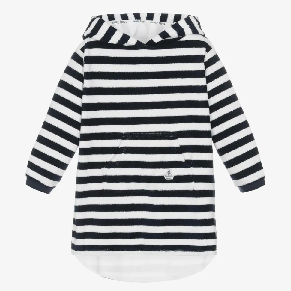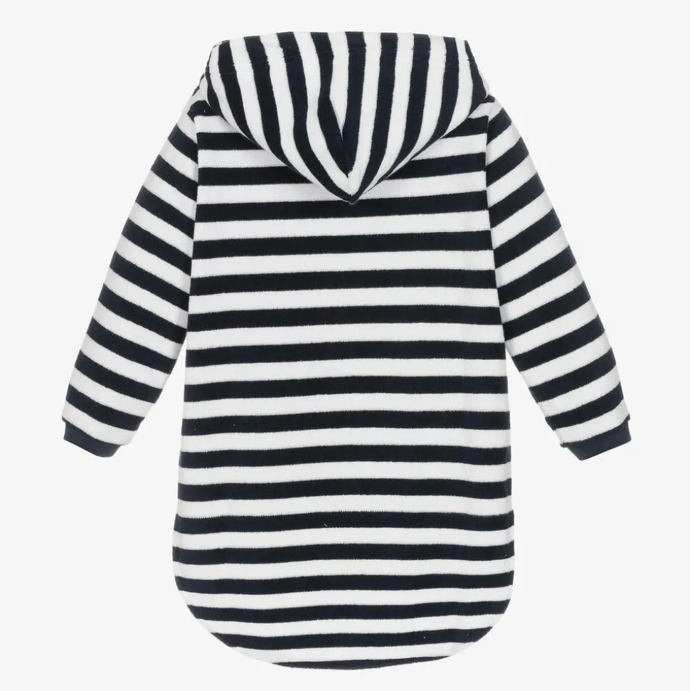 Exclusive to Childrensalon, a navy blue and white striped cotton robe for girls and boys by Mitty James, ideal for the beach or pool. Hooded and soft, it is made in absorbent towelling with a logo patch on the useful pouch pocket. Easy to wear, it is loose-fitting and just right as a comfortable, practical cover-up.