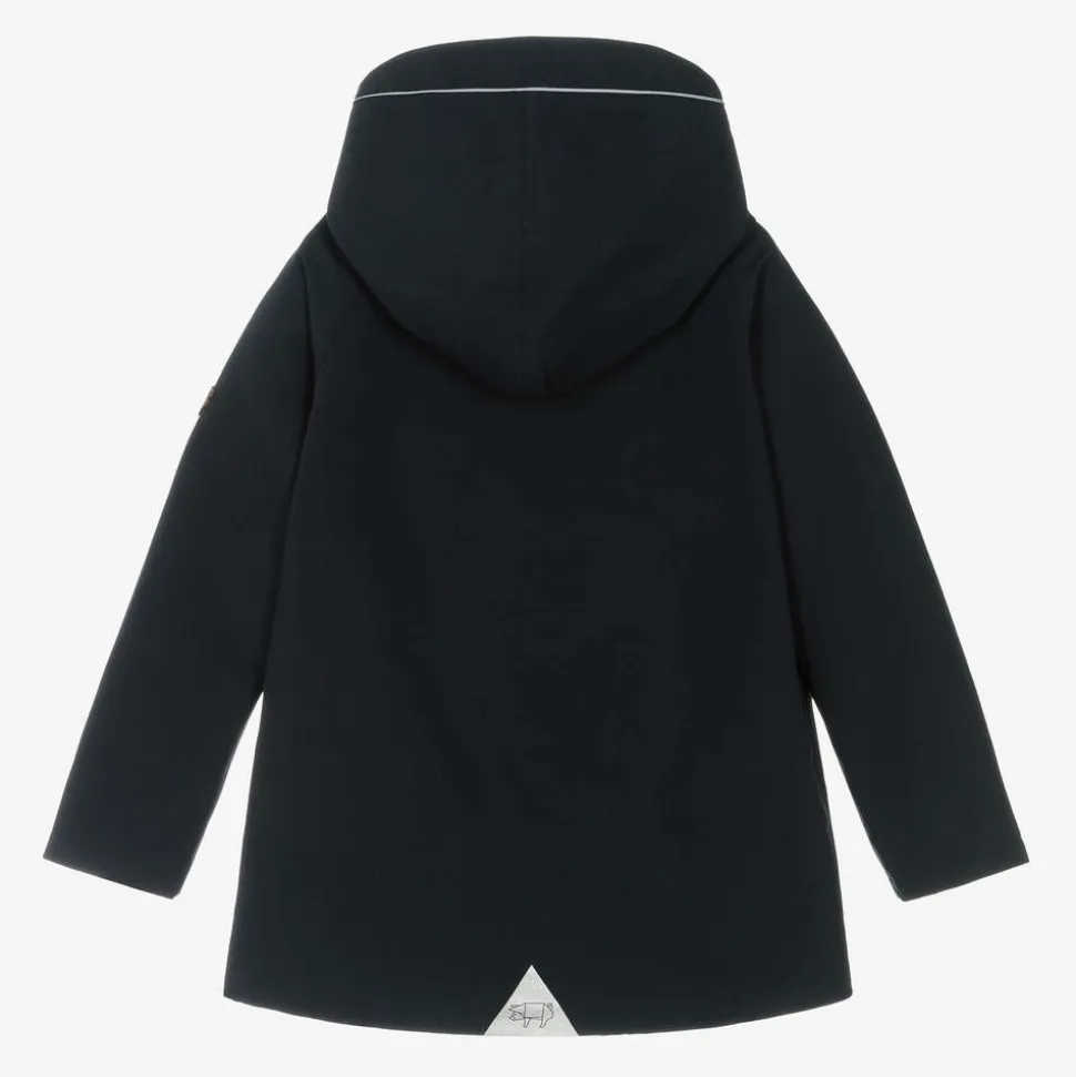 Navy blue hooded raincoat for boys and girls by British brand Töastie, made in soft recycled polyester from plastic bottles. Waterproof and breathable, it has taped seams and a soft thermal jersey lining. It has fleece lined, popper-fastening hand-warmer pockets, light reflective trims on the front pockets and back hem and micro-fleece soft chin guard for extra wind protection.