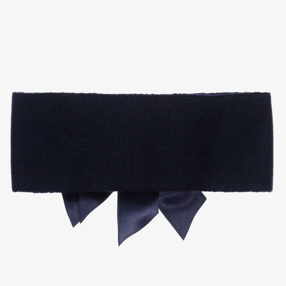Younger girls navy blue headband by La Perla. Knitted in soft wool for comfort and warmth, it is soft and stretchy and embellished with a satin bow in the centre.