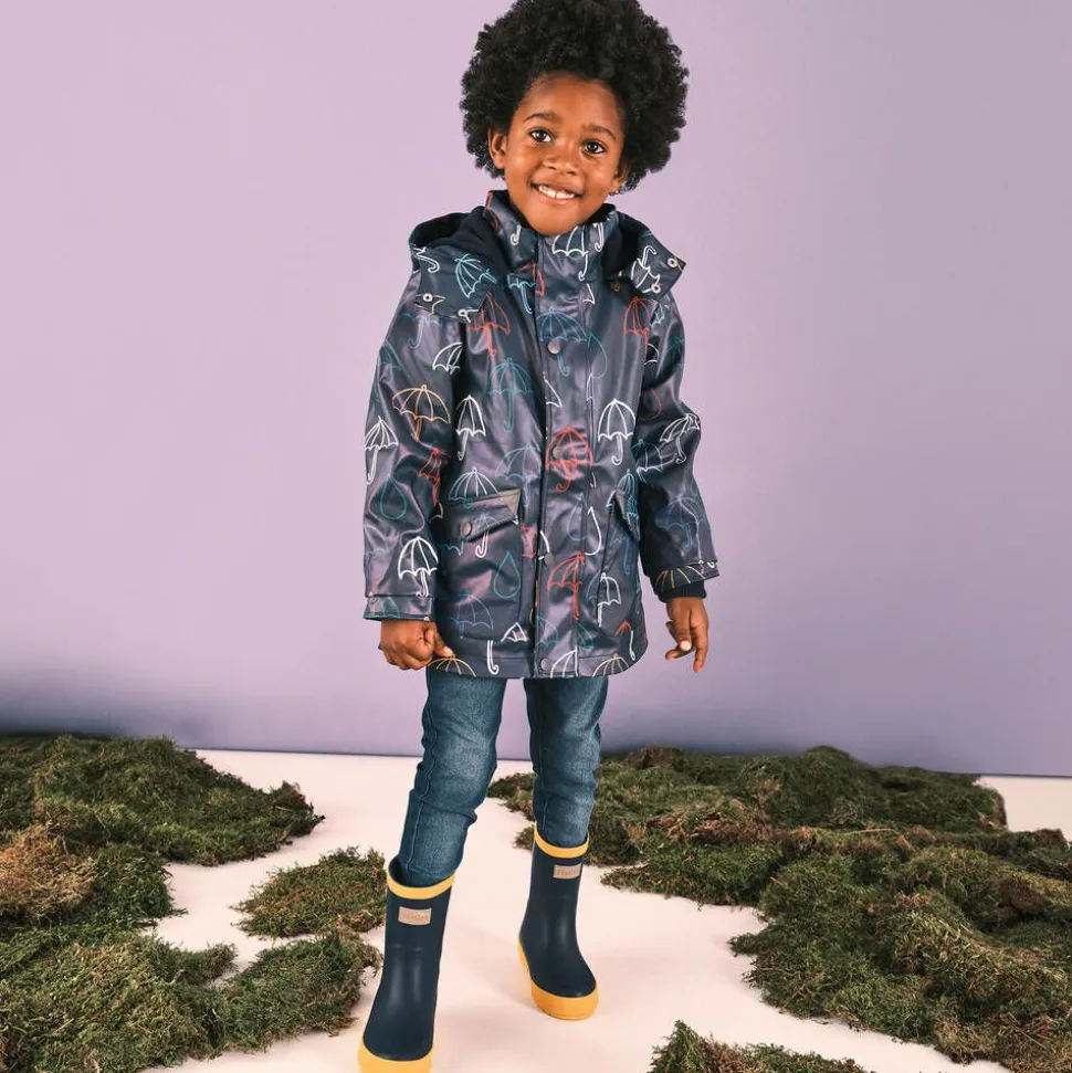 Navy blue rain boots for boys and girls by Hatley, made with waterproof PVC-free, vulcanized rubber. Ideal for rainy days, they are lined in soft cotton and feature removable insoles to keep little feet warm, dry and comfortable. They have slip-resistant outer soles for good grip and a light reflective logo