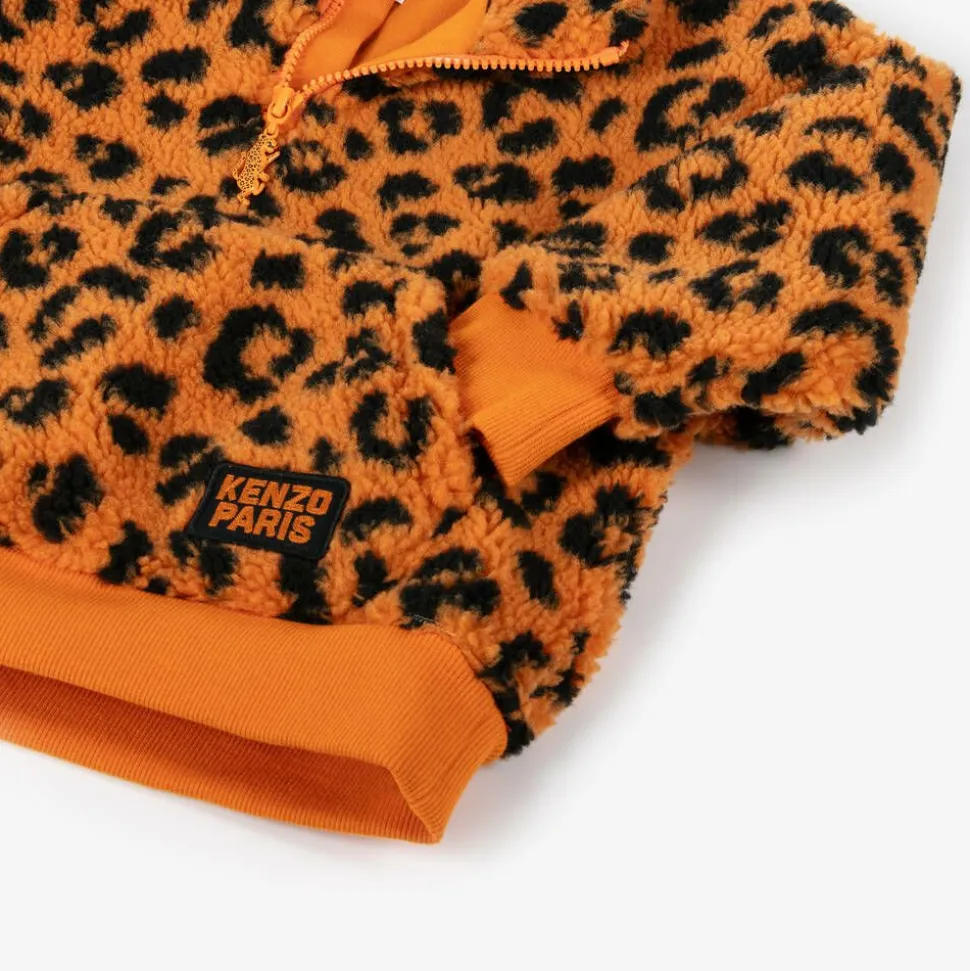 Orange zip-up top for boys and girls by KENZO KIDS, made in soft teddy fleece for a warm and cosy feel. Lined in soft jersey, this playful layering piece has a black leopard print design. There is a leopard-shaped zip pull for smaller fingers and a Kenzo Paris logo patch stitched on the pouch pocket.