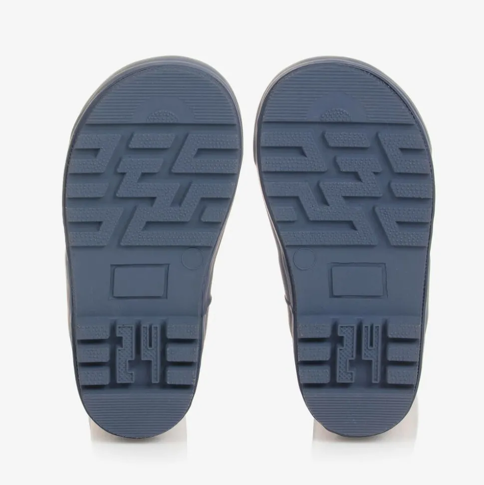 Blue and orange rain boots for boys and girls by British brand Frugi. Made from natural flexible rubber, they are patterned in fun tiger stripes with a cute tiger face on the front. The boots have a soft fabric lining to keep feet warm and comfortable, with chunky rubber soles for good grip on slippery surfaces. A rubberised logo patch on the side adds a signature finish.