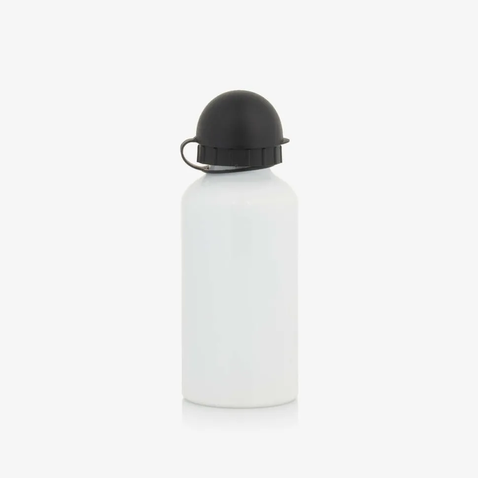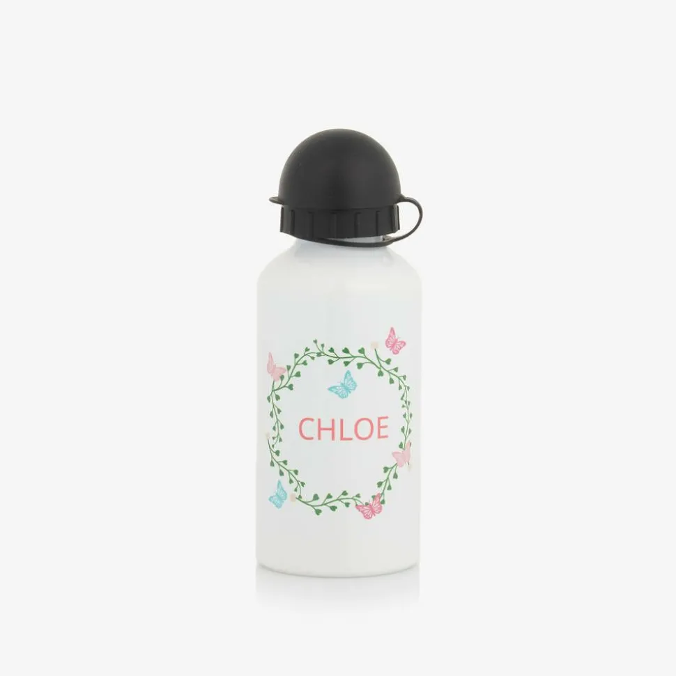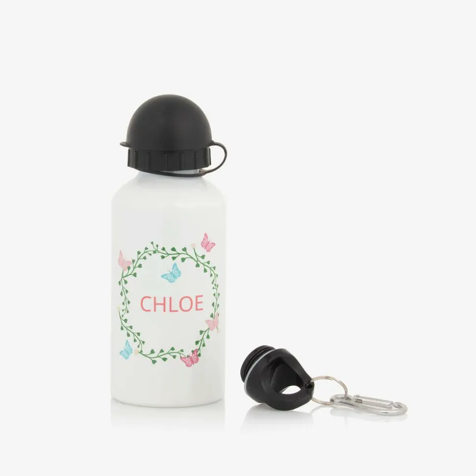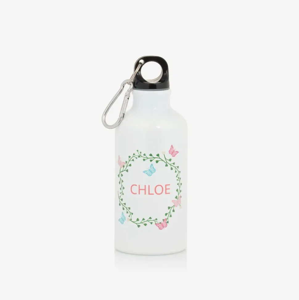 White 400ml water bottle for girls by Treat Republic. Made in strong aluminium, this school-essential is printed with a sweet butterfly garden and your child's name for a personalised touch. It comes with two different types of lids. One has a useful sports cap, and the other has a screw-top lid with a clip and keyring to attach to their backpacks.