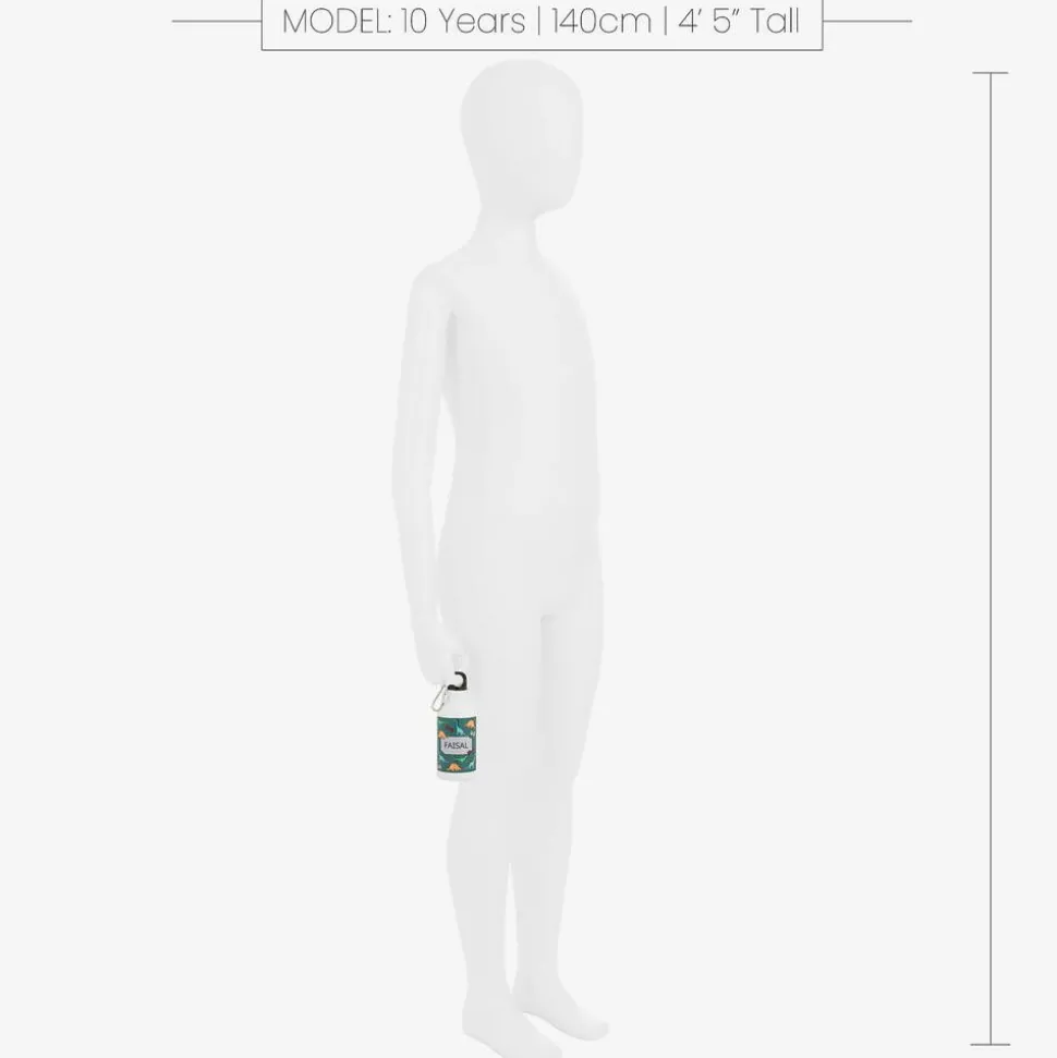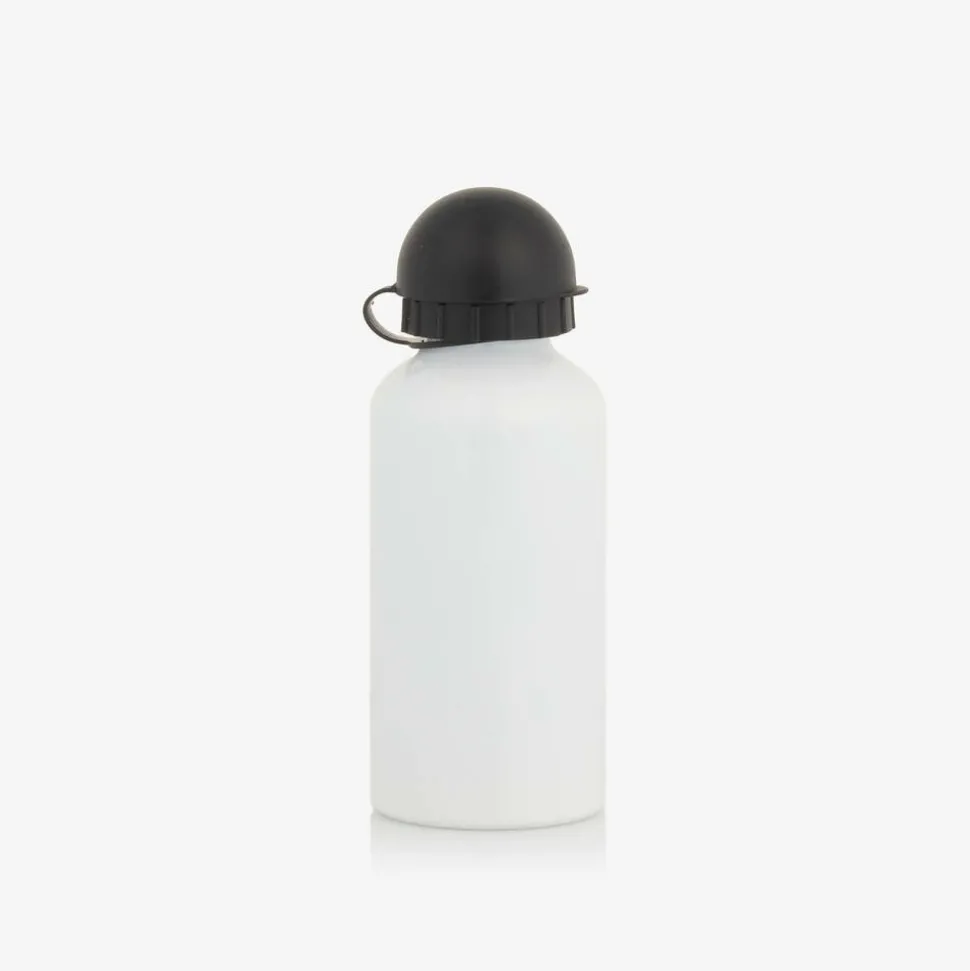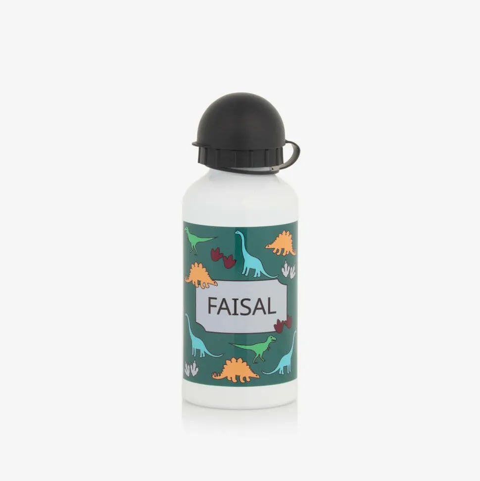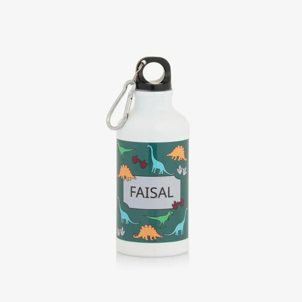 White 400ml water bottle for boys and girls by Treat Republic. Made in strong aluminium, this school-essential is printed with colourful dinosaurs and your child's name for a personalised touch. It comes with two different types of lids. One has a useful sports cap, and the other has a screw-top lid with a clip and keyring to attach to their backpacks.