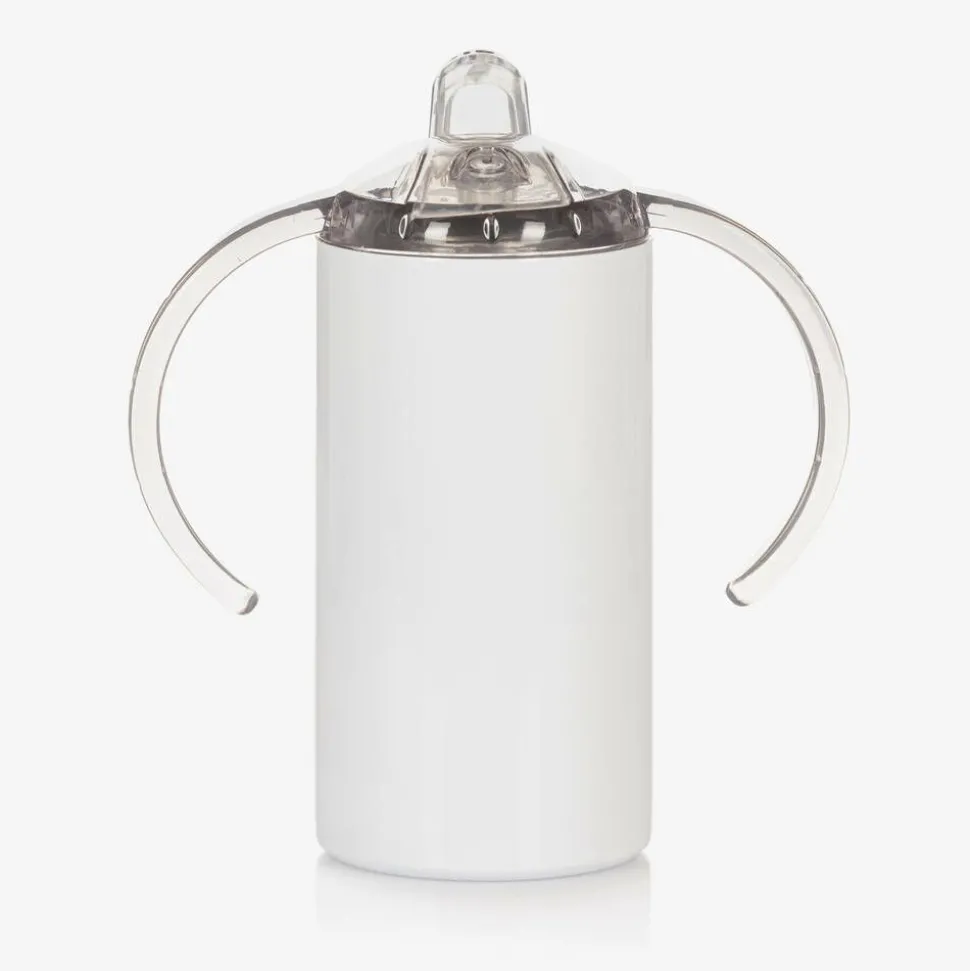 A white 400ml sippy cup for boys and girls by Treat Republic, featuring a playful gingerbread man and star design. Your little one's name can be printed underneath, adding a personalised touch to this lunchtime essential. Made in stainless steel, the cup has a useful plastic screw lid with easy-to-grip handles on the side.