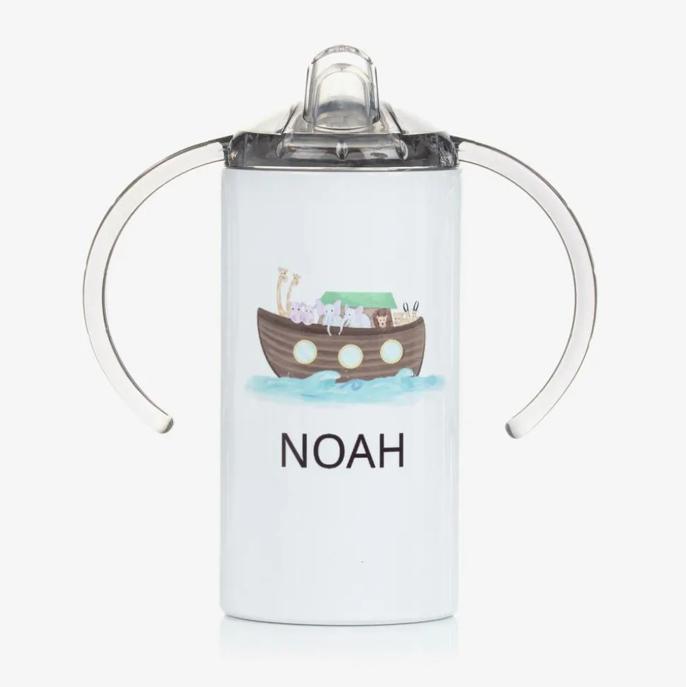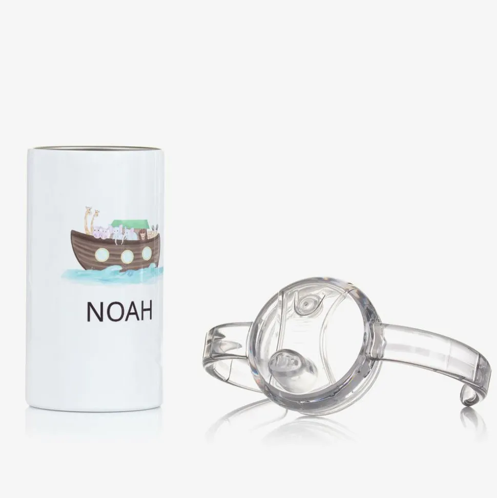 Sweet white 400ml sippy cup for boys and girls by Treat Republic, printed with a colourful Noah's Ark motif filled with cute animals on the front. Your little one's name can be printed underneath, adding a personalised touch to this lunchtime essential. Made in stainless steel, the cup has a useful plastic screw lid with easy-to-grip handles on the side.