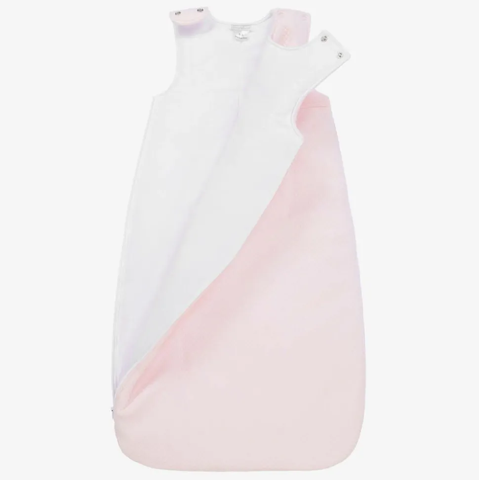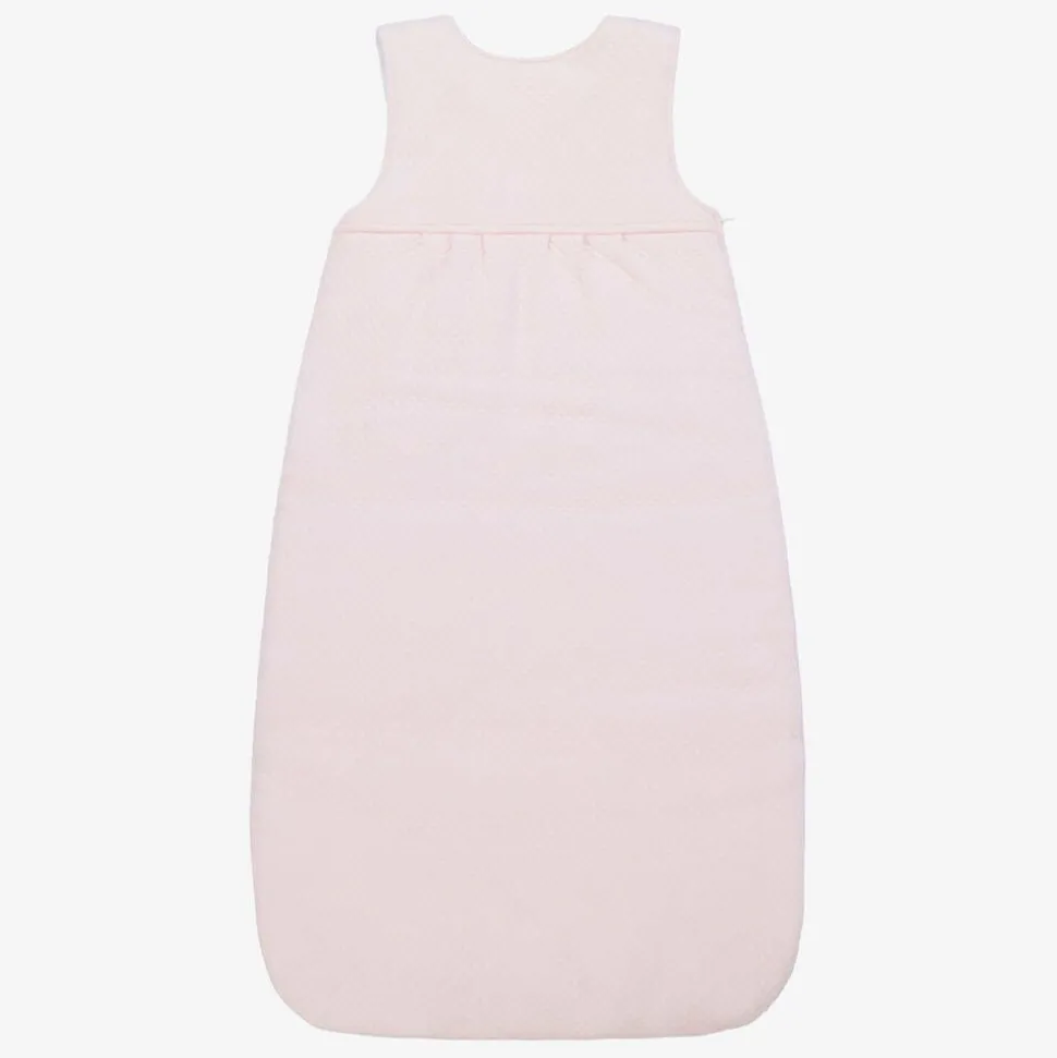Light pink sleeping bag for baby girls by Kissy Kissy, made in gentle Pima cotton with a diamond quilted effect. Both cute and practical for baby's bedtime routine, this sweet sleeping accessory is embroidered with pink teddy bears on the front. It is padded for softness and comfort with a 3.0 Tog rating. There is a zip fastening down one side and popper fastenings on the shoulder straps.