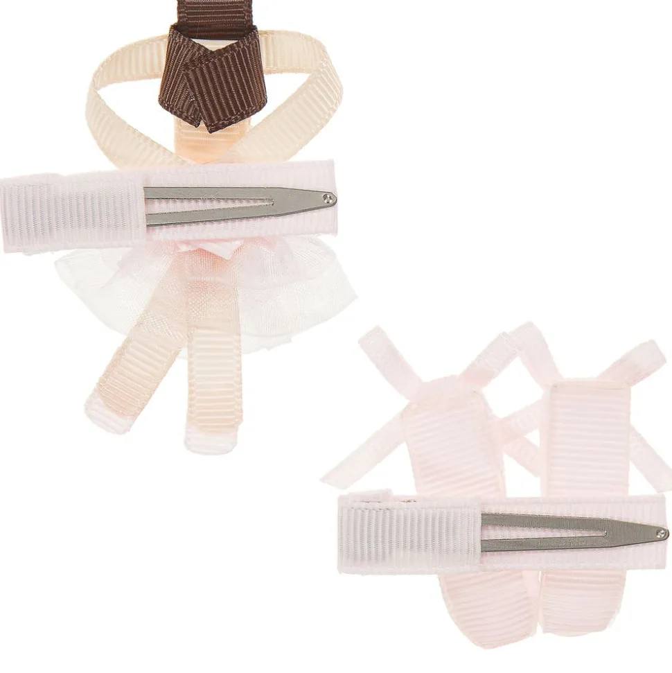 Girls adorable pack of two hairclips by Milledeux. They have a silver metallic nickle free clip with a pair of pale pink ballet shoes on one and a ballerina on the other, made from grosgrain ribbon.
