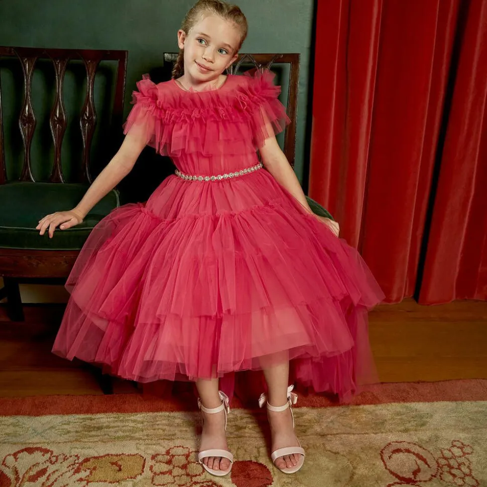 Girls special occasion sandals by Angel's Face, in pearlised pale pink faux leather with 3.5 cm-high heels. Fastening with sparkly diamanté, heart-shaped buckle on the ankle strap, they have pretty grosgrain bows on the back.