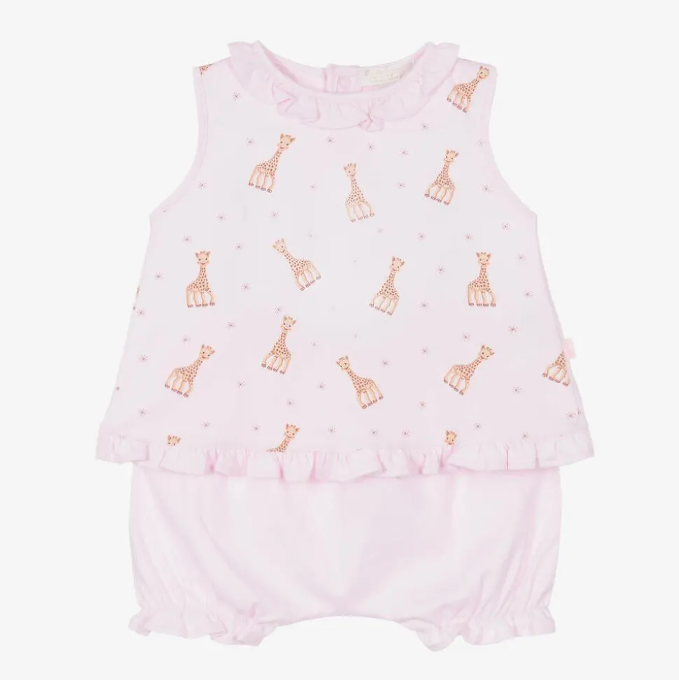Baby girls pink two piece shorts set from Kissy Kissy, made in super soft Pima cotton jersey. The top has a sweet Sophie la Girafe print, and the pink shorts have an elasticated waistband.