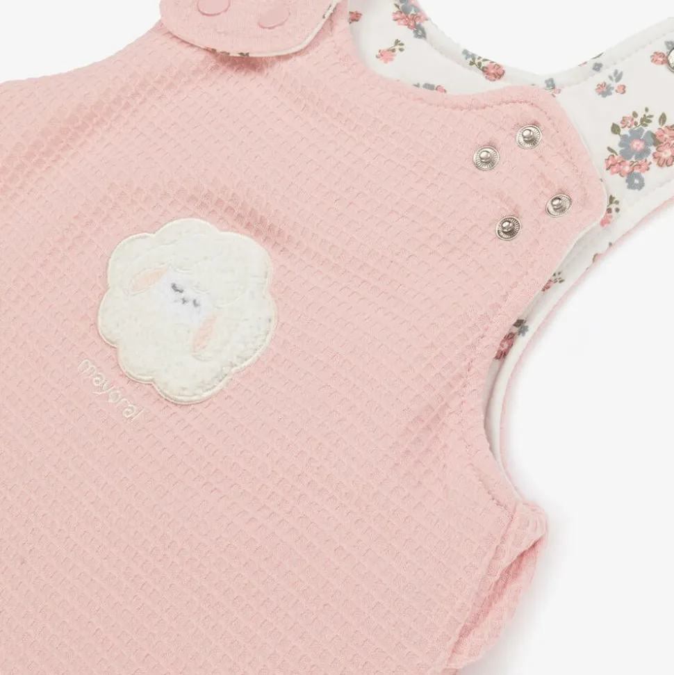 Cute pale pink sleeping bag for baby girls by Spanish brand Mayoral, with white lamb appliqué and embroidered logo on the front. Made in soft cotton-blend jersey with a textured square pattern, it is lightly padded for cosiness and lined in white jersey with a pink floral print. Fastening with a zip on one side and along the bottom, it also has adjustable poppers on the shoulders for added practicality. The size of the sleeping bag can be altered by folding up and fastening the bottom with poppers.