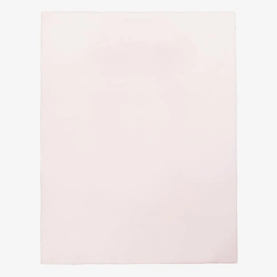Pink padded blanket for baby girls by Sofija, made in soft cotton jersey. An attractive nursery accessory, it has a beautiful princess castle and flower illustration in pink on the front, together with a satin horse and carriage appliqué, embellished with sparkly diamantés and metallic silver embroidery. It has a silky satin trim at the top, with a gorgeous oversized satin bow to finish.