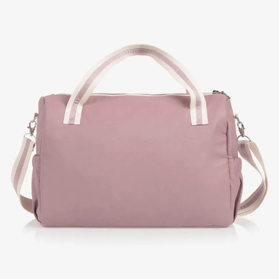 Lovely and practical beige changing bag by Spanish brand, Paz Rodriguez. It is made in soft and water-resistant faux leather with a grained-texture and a lightly quilted lining. Fastening with a top zip, the main compartment has two slip pockets and elasticated side straps, useful for organising baby essentials on the go. In addition, there is a removable rigid base so the bag can stand better if preferred and further three slip pockets on the exterior. It comes with two ivory woven carry handles, a matching detachable shoulder strap and two buggy straps.