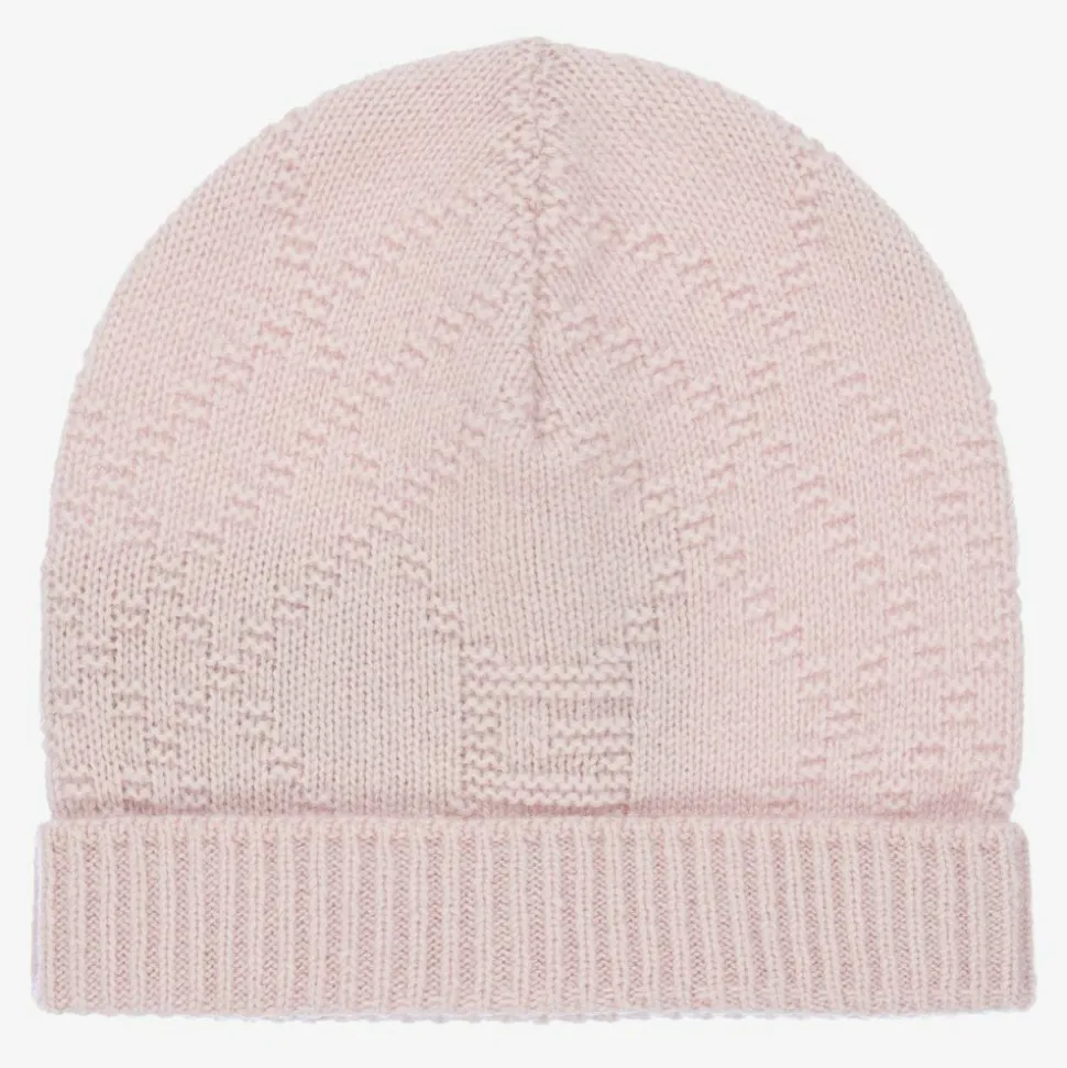 A sweet pink hat for baby girls by luxury Italian brand Gucci, knitted in luxuriously soft cashmere. It has a ribbed, turn-up brim and G logo pattern within the knit.