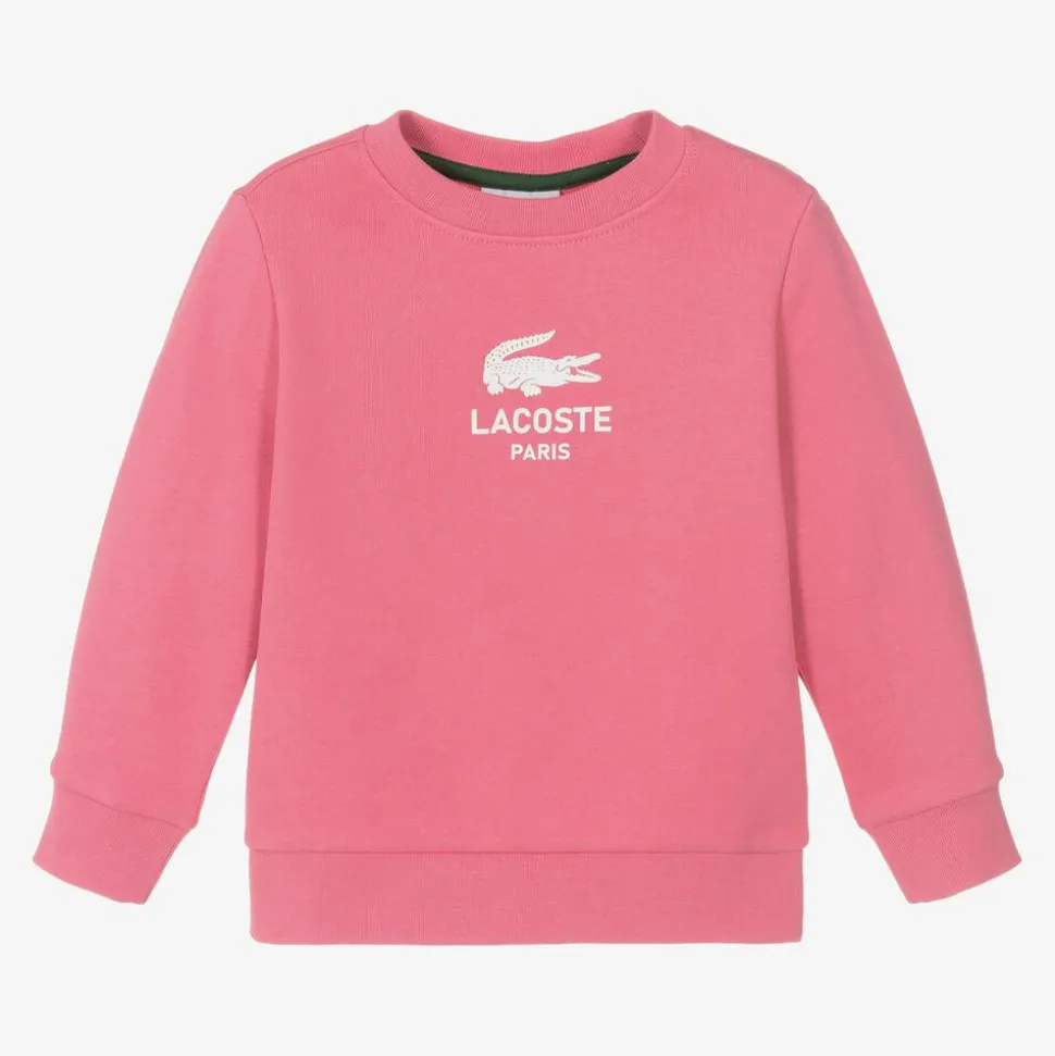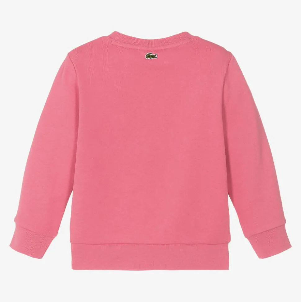 Mid pink sweatshirt for boys and girls by Lacoste, made in mid-weight organic cotton jersey. Combining comfort and style, this long-sleeved top has a casual crew neckline and comfortable ribbed detailing. The brand's iconic logo is printed on the front in white and a small green crocodile patch is stitched on the back for further designer detailing.