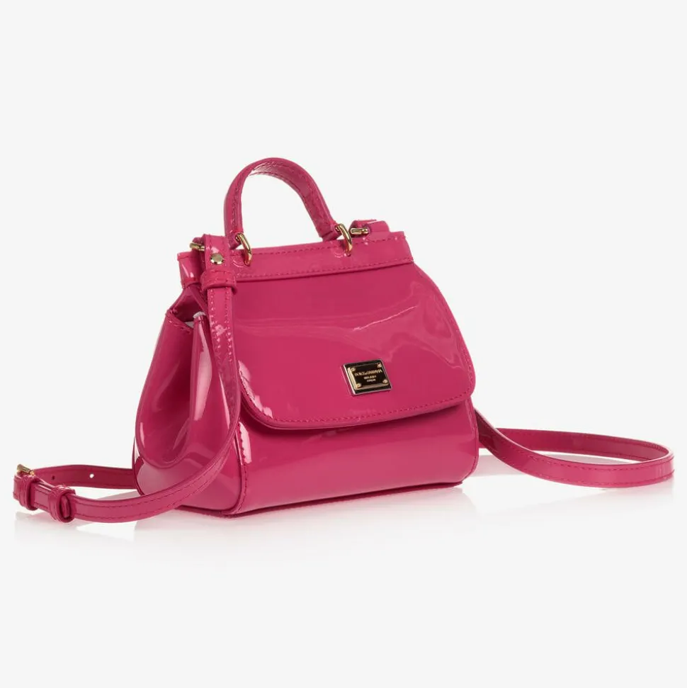 A fuchsia pink Mini-me Sicily bag for girls from luxury designer Dolce & Gabbana. This gorgeous bag is made in glossy patent leather, with golden hardware to complement the vibrant pink colour palette. A gold and silver metal logo plate is appliquéd on the magnetic popper-fastening flap, and the lining is made in silky-soft satin. There is a carry handle on the top and a detachable, adjustable shoulder strap.