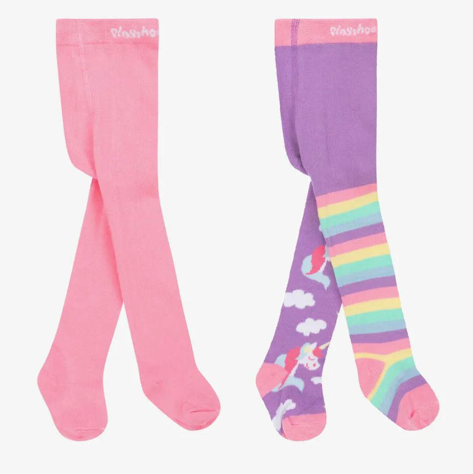 Two pairs of knitted tights for girls by German brand Playshoes. Made in a soft cotton blend, they are soft next to skin and are stretchy for a better fit. One pair is pink with a white logo on the waist and the other is purple with a sweet unicorn print and rainbow striped feet.