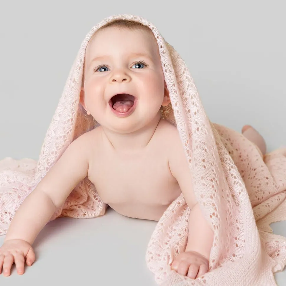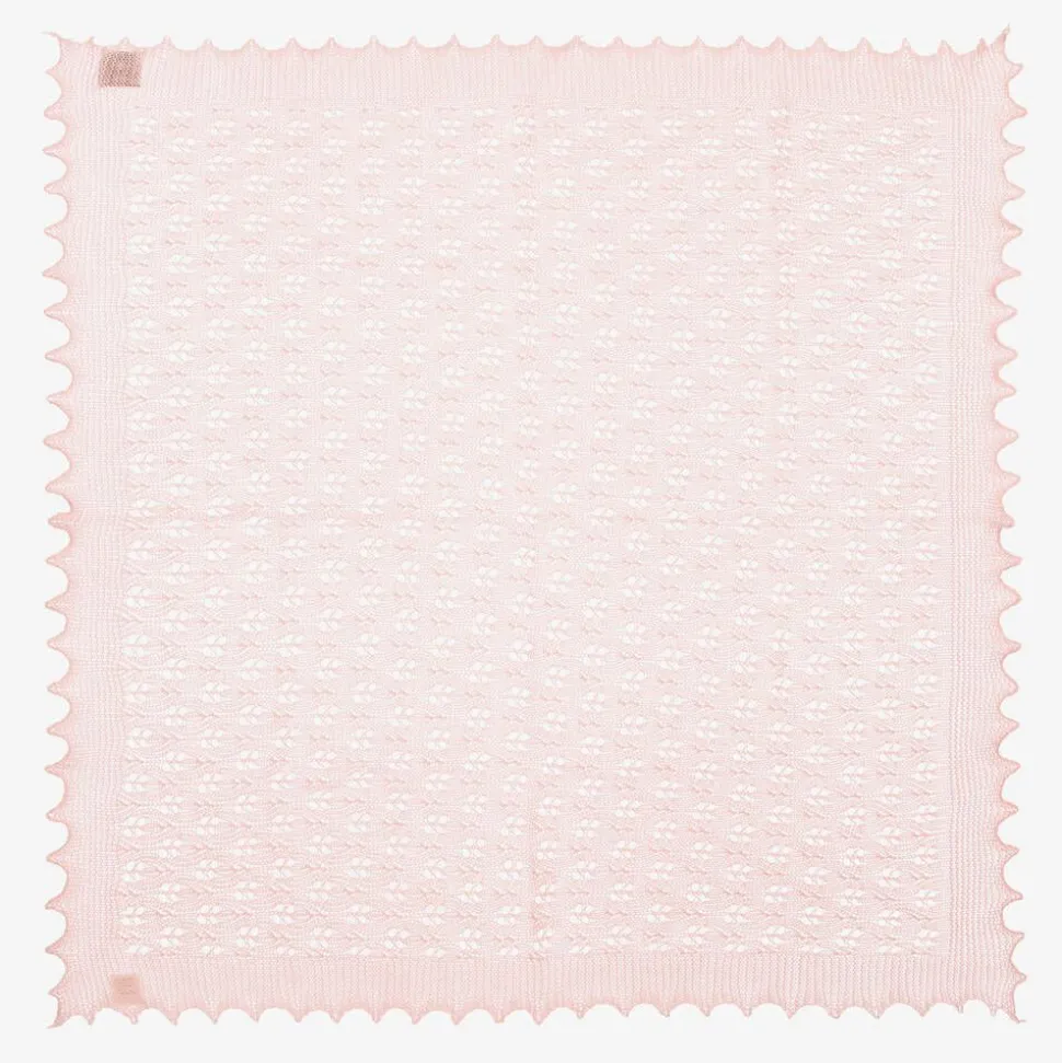 A charming pale pink gift set for baby girls by G. H. Hurt & Son, beautifully presented in a box. Handcrafted using traditional artisan techniques, the wool and cotton blend shawl is knitted in a lightweight lace design with scalloped edges. It is luxuriously soft and lightweight, ideal for wrapping newborns in a comforting embrace. The double-layered ivory bib is made from delicate micro modal and organic combed cotton, featuring a signature fawn motif and pink picot stitching. It fastens with a popper on the neck. A wooden brush with natural bristles completes this heirloom set.