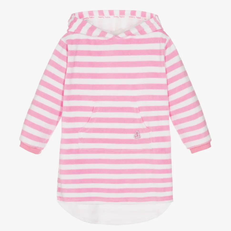 Exclusive to Childrensalon, a pale pink and white striped cotton robe for girls and boys by Mitty James, ideal for the beach or pool. Hooded and soft, it is made in absorbent towelling with a logo patch on the useful pouch pocket. Easy to wear, it is loose-fitting and just right as a comfortable, practical cover-up.