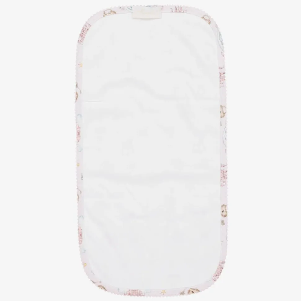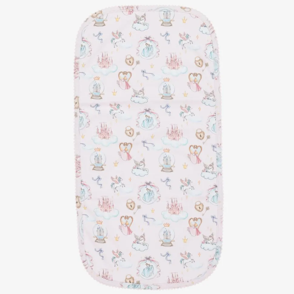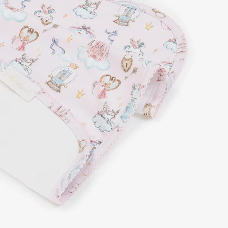 Pale pink muslin for baby girls by My Little Pie, with a charming fairy tale princess and castle print. Made in super soft organic Supima cotton jersey and edged in delicate picot embroidery, it is ideal for use as a burping cloth or nursing cover.