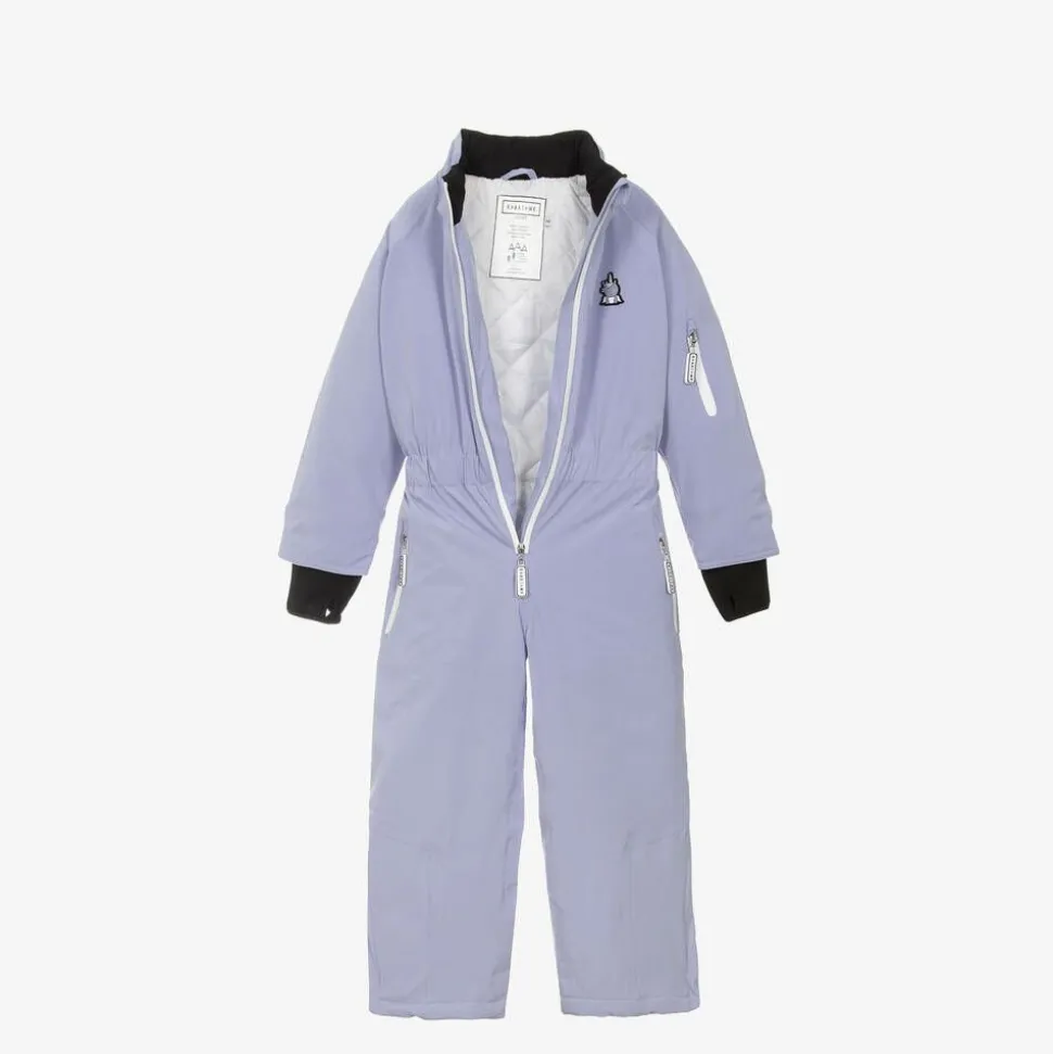 A lilac purple zip-up snowsuit for girls from Roarsome, in the brand's Sparkle the Unicorn theme. The fun design features horn and ears appliqués on the hood, little white wings detailing and a rubber patch on the chest. Made in recycled matt fabric with a waterproof finish, it is insulated for maximum warmth on the slopes, with taped seams and sealed zips. It has adjustable velcro straps on the cuffs to fit around gloves, a zip-up ski pass pocket and internal leg gaiters to accommodate snow boots. The hood is detachable and has a removable faux fur trim. This snowsuit is generously sized to allow room for your little one to grow.