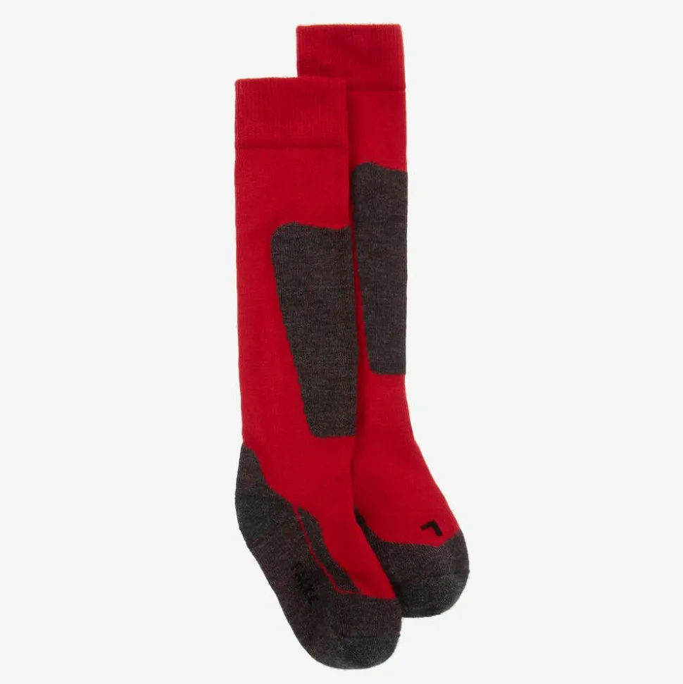 Red and grey knee-high ski socks for boys and girls by Falke. Made in a wool blend that acts as thermal insulation, they are designed for warmth, moisture control and comfort, and come with cushioned shinbone padding.