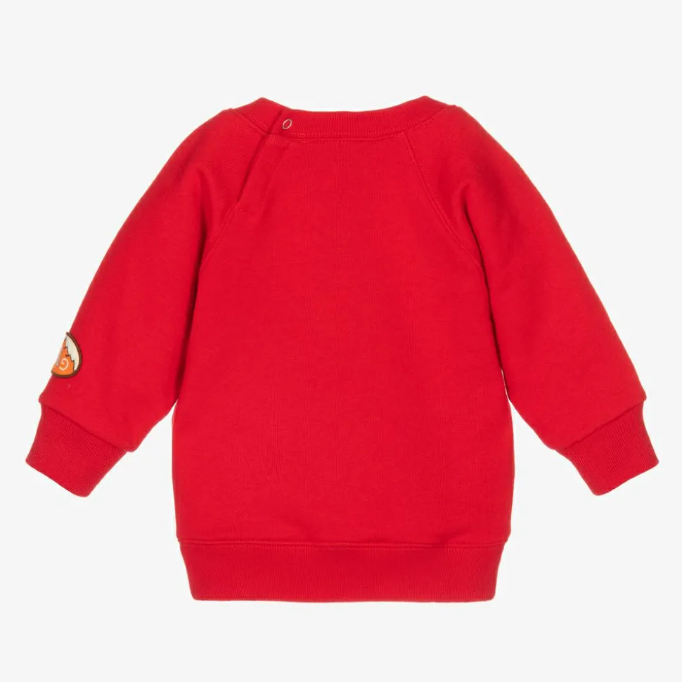Red cotton sweatshirt for baby boys and girls by luxury Italian brand Gucci. The front has 'Guccy ciel de nuit mon petit chou' and a lovely teddy bear in a beige velvet print. The French phrase references a nickname for the house, the night sky and a term of endearment. It has an orange logo patch on the raglan sleeve and popper fastening on the back.