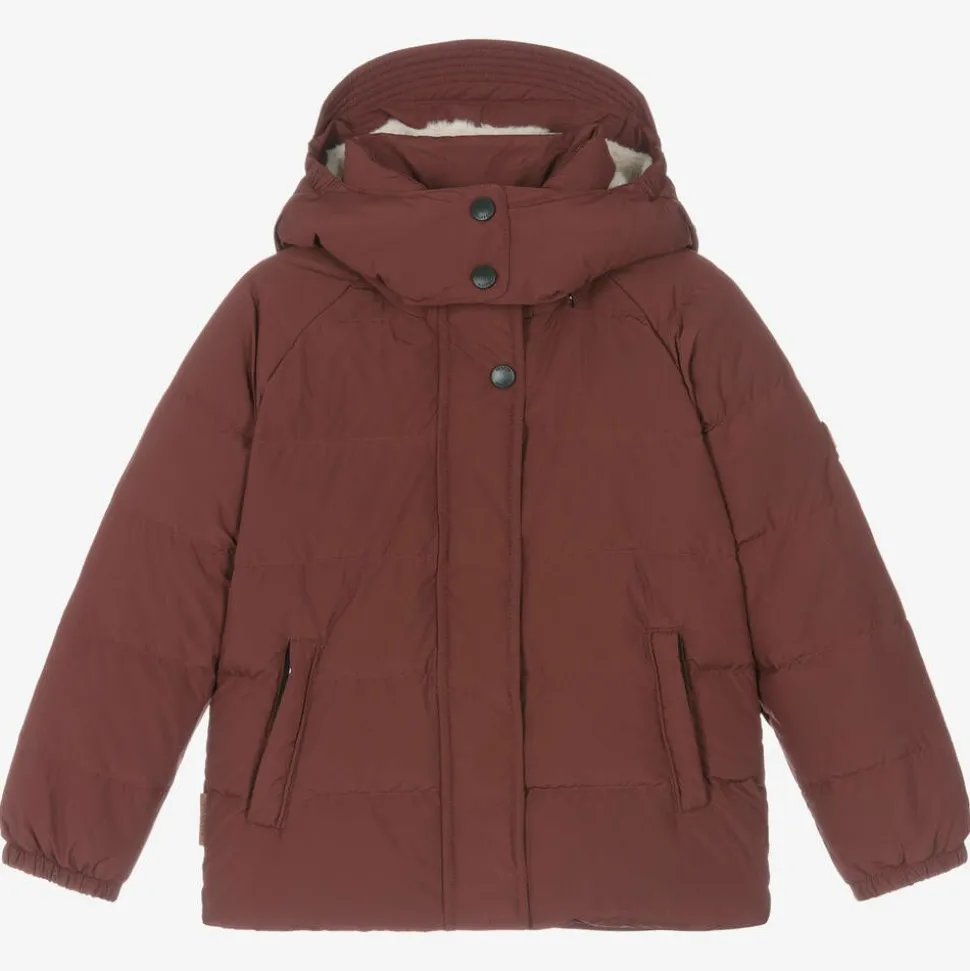 Burgundy red puffer coat for boys and girls by British brand, Töastie. Silky smooth and water repellent, it is padded with recycled down to be lightweight whilst still providing superior warmth. Designed for a good fit, the hood is lined in soft cosy fleece and can easily be removed when not in use. To keep out chilly winds, the cuffs are elasticated and the concealed front zip fastening is covered by a popper fastening storm flap. There is an easy-grip zip puller, a subtle reflective safety detail on the back and fleecy lined pockets to keep little hands warm.