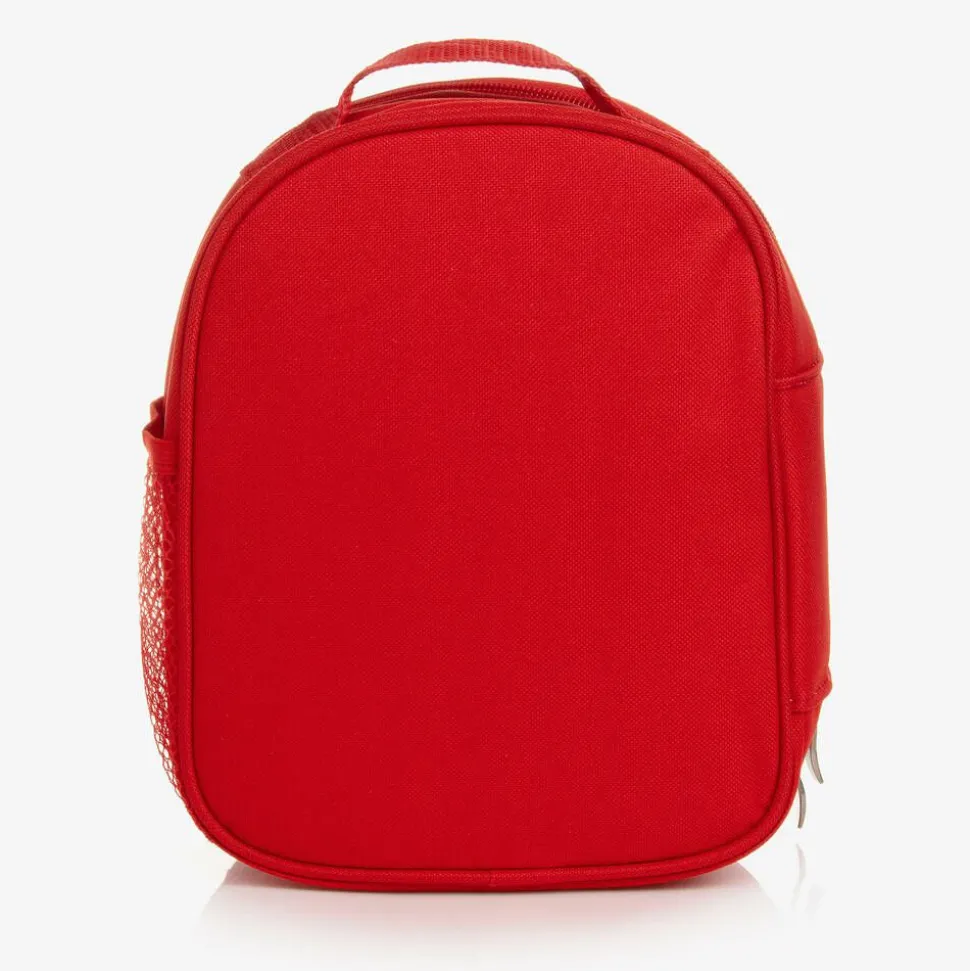 A red personalised lunch bag for boys by Treat Republic, with a fun blue superhero print. It has a zip-up main compartment with an elasticated pocket on the inside for organisation and a mesh pocket for their bottle on the outside. The smooth insulated lining is easy to clean, great for keeping food cool and hygienic. There is a removable flap-over front with a slip pocket.