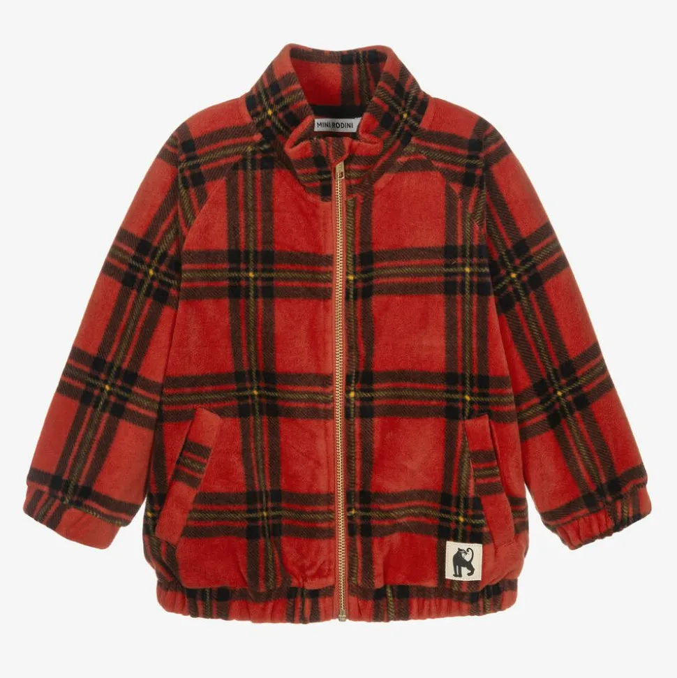 From Swedish designer, Mini Rodini, a red tartan zip-up top for boys and girls. This beautifully soft fleece top is ideal for layering on cooler days, with the high neck and gold zip fastening to keep the warmth in. There are two hand pockets and a black panther mascot patch stitched on the front. This product contains recycled materials made from post consumer waste.