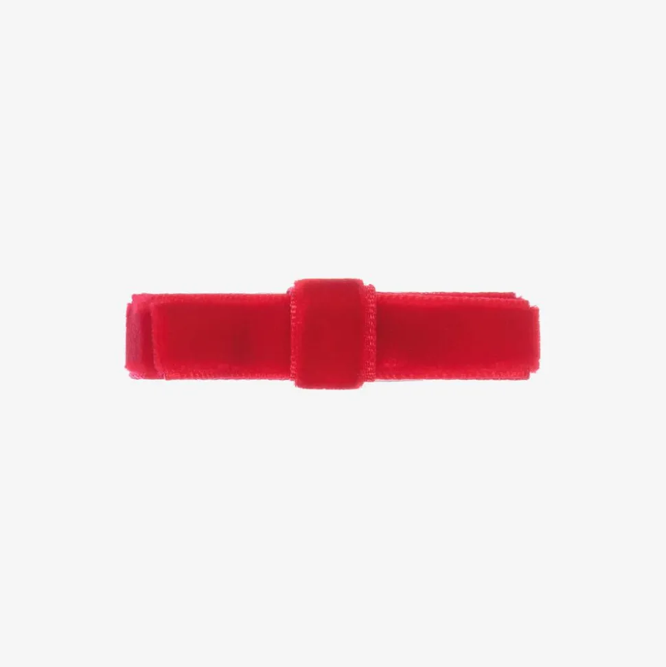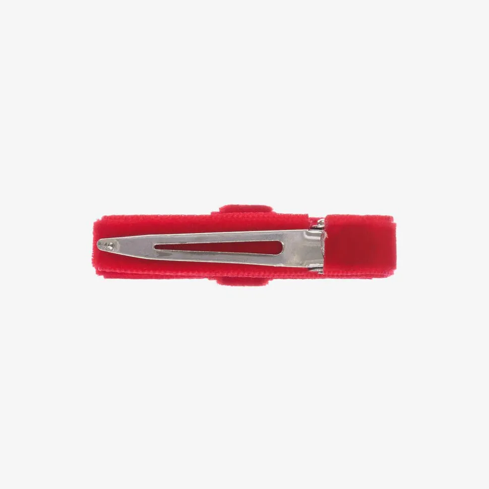Girls sweet red velvet bow hair clip by Peach Ribbons, handmade and set on a slide-in metal clip.