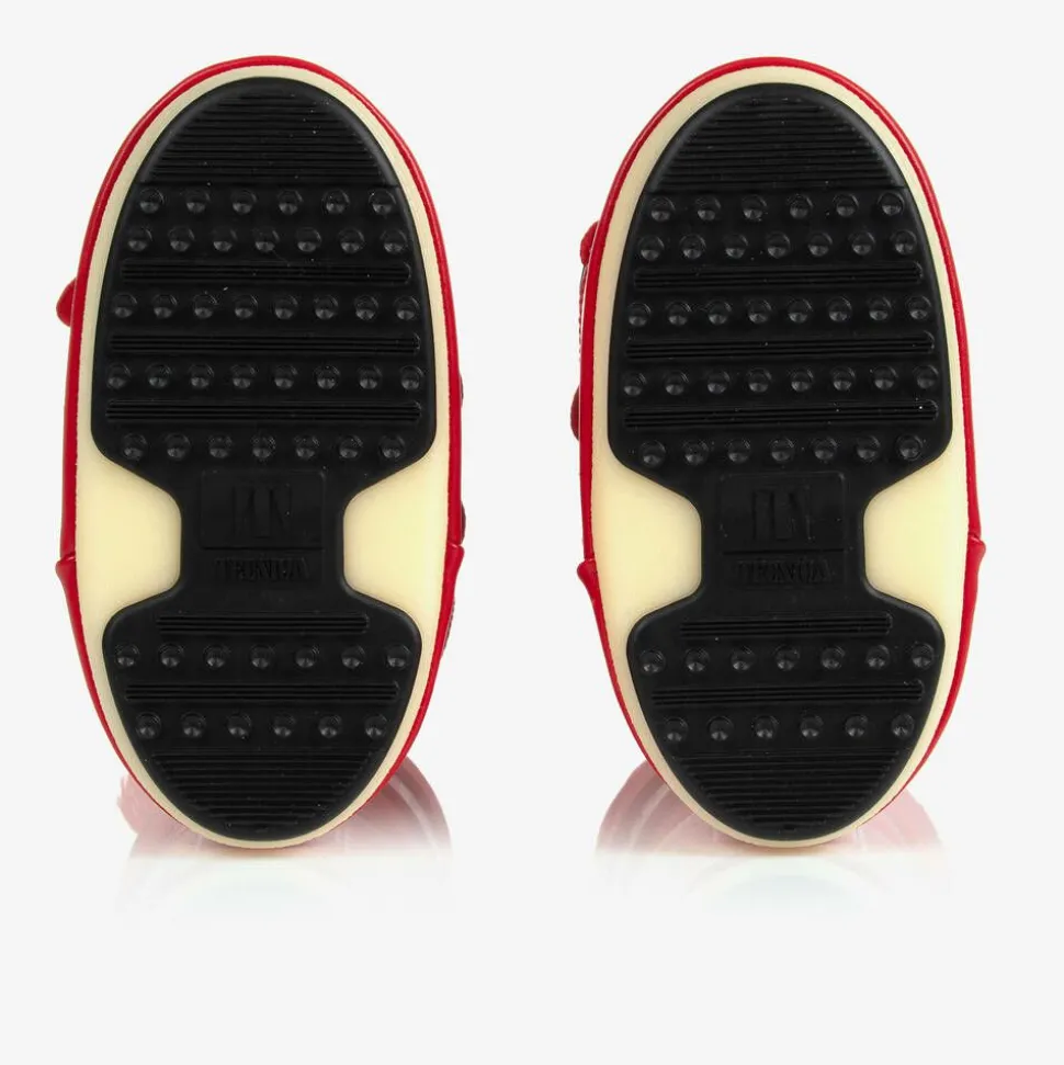 Red snow boots for boys and girls, by Italian brand Moon Boot, with a white logo printed panel for a bold and iconic look. Heavily padded and ultra resistant in the original style, they feature a two-tone thermoplastic sole with little suction pads at the bottom for improved grip. They have faux leather trims with further logo branding, a stylish lace-up look and a drawstring tie on the cuffs for a warm and comfortable fit. The technological foam lining will feel snug at first but will mould to the size and shape of the foot after a few hours of wear.