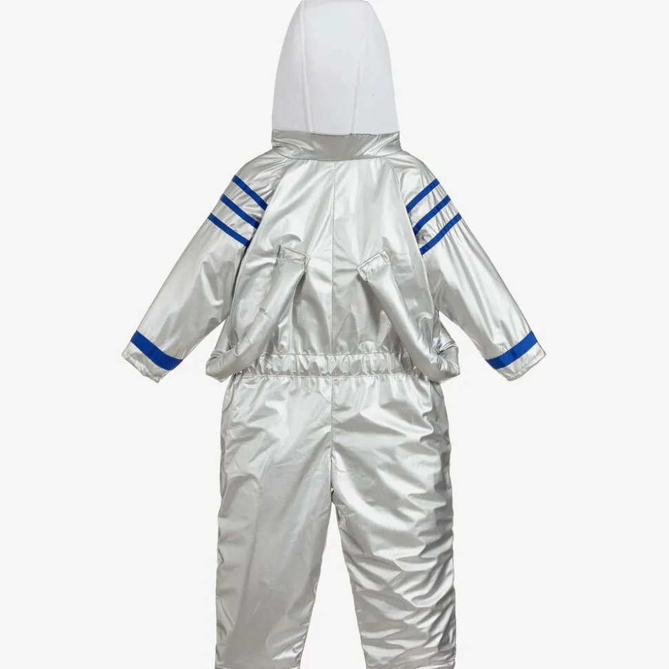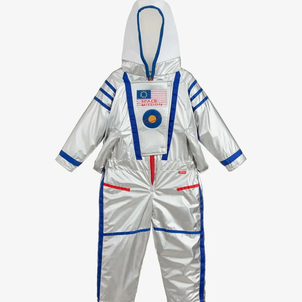 Boys and girls will have fun dressing up in this silver astronaut overall by Souza. Made in lightly padded nylon with smooth lining, red and blue grosgrain ribbon trims and a white velvety hood. The velcro fastening front panel has space-themed patches on the front.