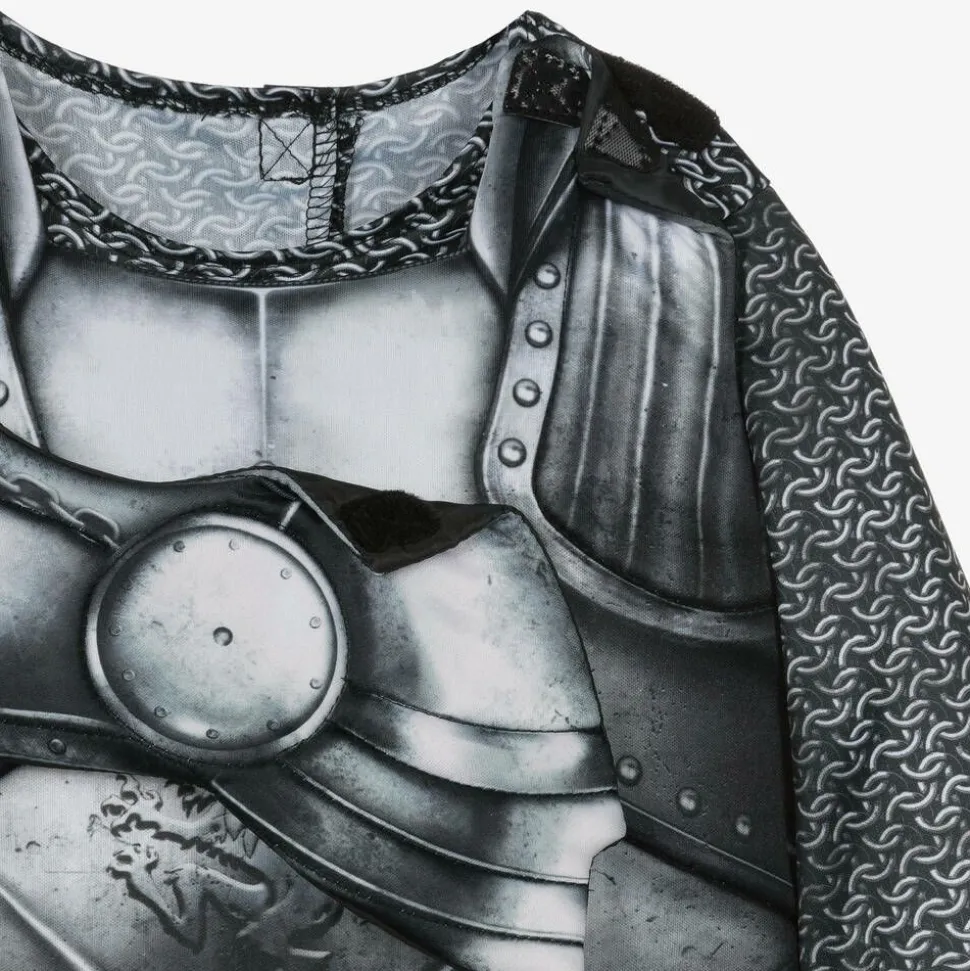 Transform into a knight in shining armour in this silver dressing-up costume for boys and girls, by Dress Up by Design. It comes with a stretchy chainmail top and matching trousers, styled with an armour-like print for a battle-ready look. A padded vest, chainmail balaclava and coordinating metal-effect collar add authenticity to the playful costume. To accessorise the medieval set, it comes with a metal shield and play sword.