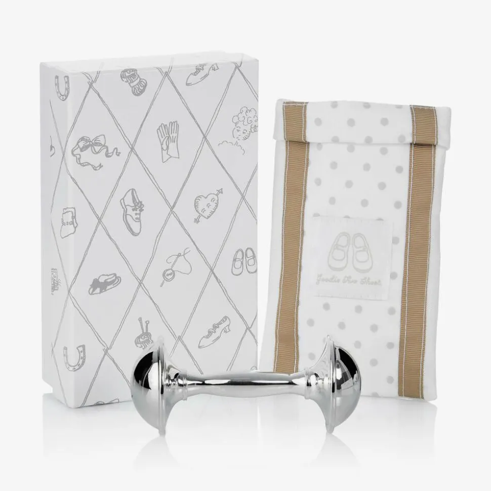A sweet silver plated rattle for baby boys and girls from English Trousseau. An ideal gift, this traditional Victorian-style rattle comes with a beautiful ivory and beige polka dot cotton storage pouch with a sweet 'Goodie two shoes' patch.