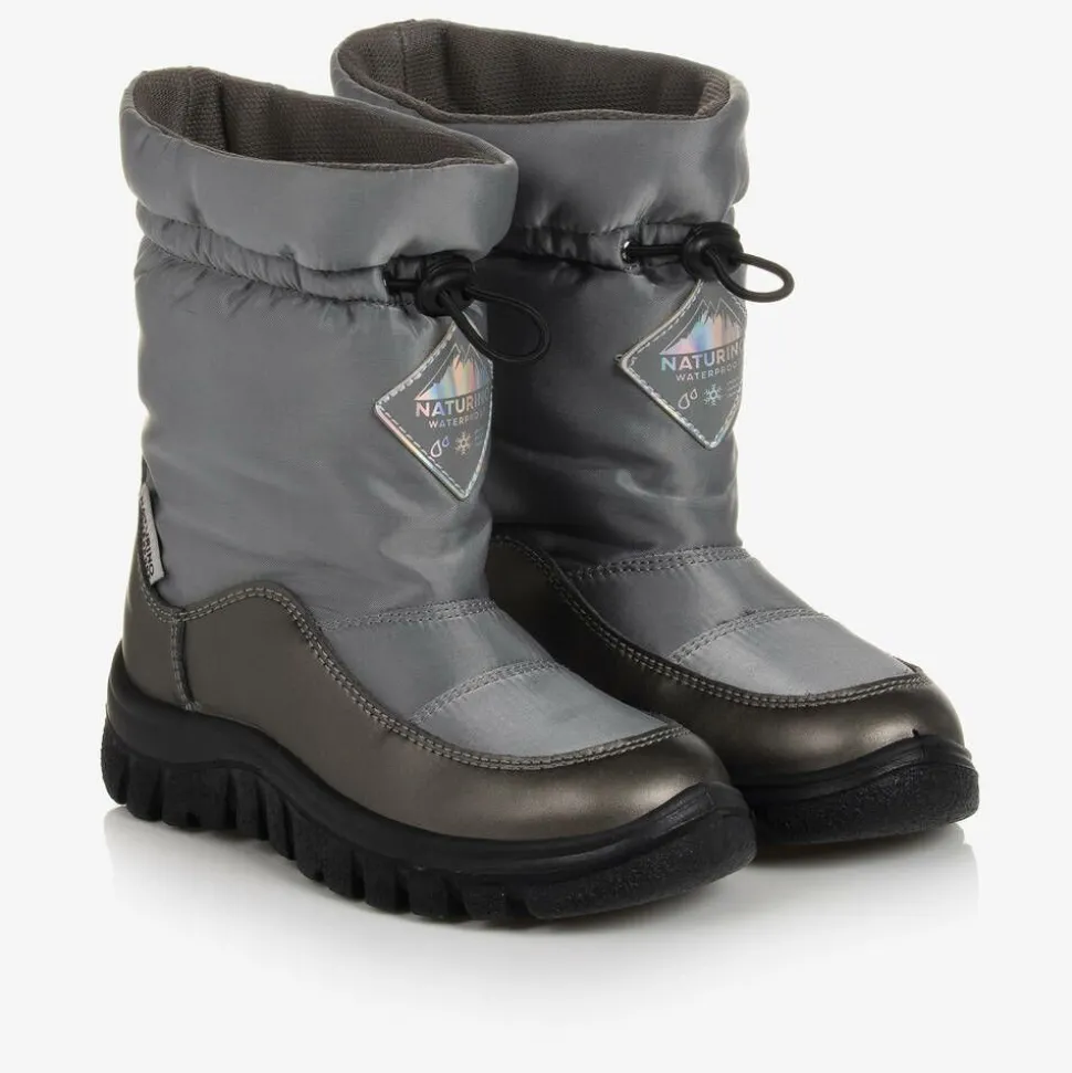 Dark silver waterproof snow boots for boys and girls by Naturino, with a matching leather trim. Ideal for wet weather, these slip-on boots have a warm fleecy lining and a drawstring toggle fastening around the ankle to keep the cold out. The non-slip rubber outsoles provide good grip, and there is a holographic logo patch on the front for a cool, designer finish.