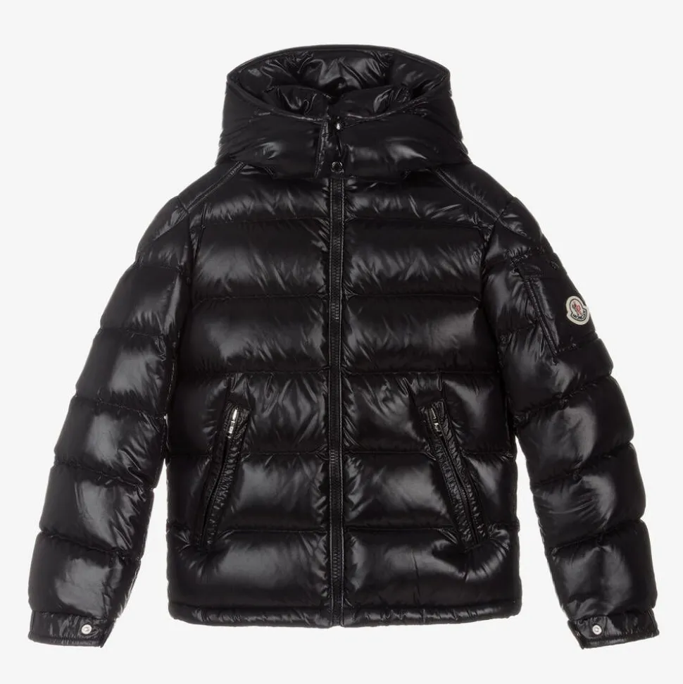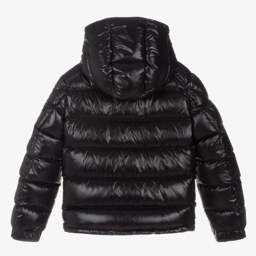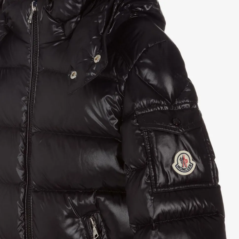 A black puffer jacket for teen boys by Moncler Enfant, featuring the iconic logo badge on the sleeve pocket. For contemporary yet functional styling, this warm down-filled layer has logo-embossed popper fastening cuffs and secure zip-up pockets. It has a water-repellent coating and a removable hood that fastens to the neck with poppers.